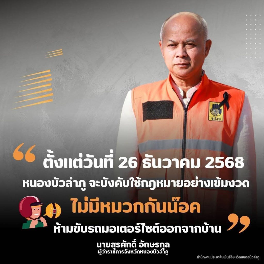 และร่วมกันปฏิบัติอย่างเข้มข้นในการขับขี่ช่วงปีใหม่”เป้าหมายสูงสุดของปี 2569 คือ การลดจำนวนครั้งการเกิดอุบัติเหตุ จำนวนผู้บาดเจ็บ (Admit) และผู้เสียชีวิตให้เหลือน้อยที่สุด โดยขอความร่วมมือพี่น้องประชาชนให้ความสำคัญกับการเตรียมความพร้อมของพาหนะ และปฏิบัติตามกฎจราจรอย่างเคร่งครัด เพื่อให้ช่วงเทศกาลปีใหม่นี้เป็นช่วงเวลาแห่งความสุขของทุกครอบครัว” พร้อมฝากประชาสัมพันธ์สำหรับผู้ติดต่อราชการในศูนย์ราชการจังหวัดหนองบัวลำภู ใส่หมวกกันน็อคเข้าพื้นที่บริเวณศาลากลางจังหวัดหนองบัวลำภูโดยเด็ดขาด ตั้งแต่วันที่ 26 ธันวาคม 2568 เป็นต้นไปทั้งนี้ ประชาชนสามารถติดตามข้อมูลการจราจรหรือขอความช่วยเหลือกรณีฉุกเฉินได้ที่ สายด่วนนิรภัย 1784 หรือ โทร. 042-316710