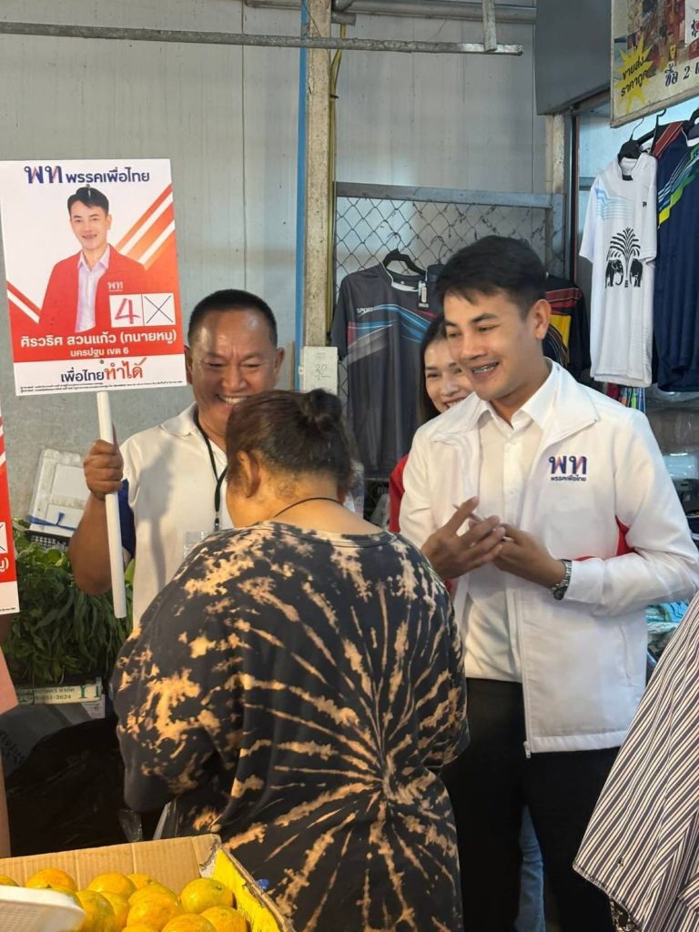 นาย ศิรวริศ สวนแก้วหรือทนายหมู ผู้สมัครส.ส.นครปฐม เขต 6 พรรคเพื่อไทยเบอร์ 4 ลุยลงพื้นที่ขอคะแนนเสียง กับพ่อแม่พี่น้อง ประชาชน ที่มาเดินจับจ่ายใช้สอย ที่ตลาดนัดหน้าโรงเรียนวัดไร่ขิง โดยพี่น้องประชาชนให้ความสนใจ นโยบายของพรรคเพื่อไทย เพราะมีผลงานในอดีตที่ผ่านมาทุกนโยบายสามารถจับต้องและทำได้จริง และได้ผู้สมัคร ส.ส. หนุ่มไฟแรง หวังปักธงส.ส.นครปฐม ในนามพรรคเพื่อไทย เขตเลือกตั้ง 6 ได้ในครั้งนี้