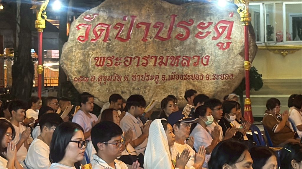 เมื่อวันที่ 31ธค.เวลา22.00น.ที่วัดป่าประดู่ พระอารามหลวง มีพิธีสวดมนต์ข้ามปี มีพุทธศาสนิกชนแต่งชุดขาวมาบำเพ็ญภาวนาสมเด็จพระพันปีหลวง มี พระวชิรปัญญากร เจ้าอาวาสวัดป่าประดู่ และเจ้าคณะอำเภอเมืองระยองเป็นประธานฝ่ายสงฆ์ ดร.แดน ปรีชา ประธานพิธีฝ่ายฆราวาสมีประชาชนมาร่วมพิธีสวดมนต์ข้ามปีทั้งหมด 813 คน
