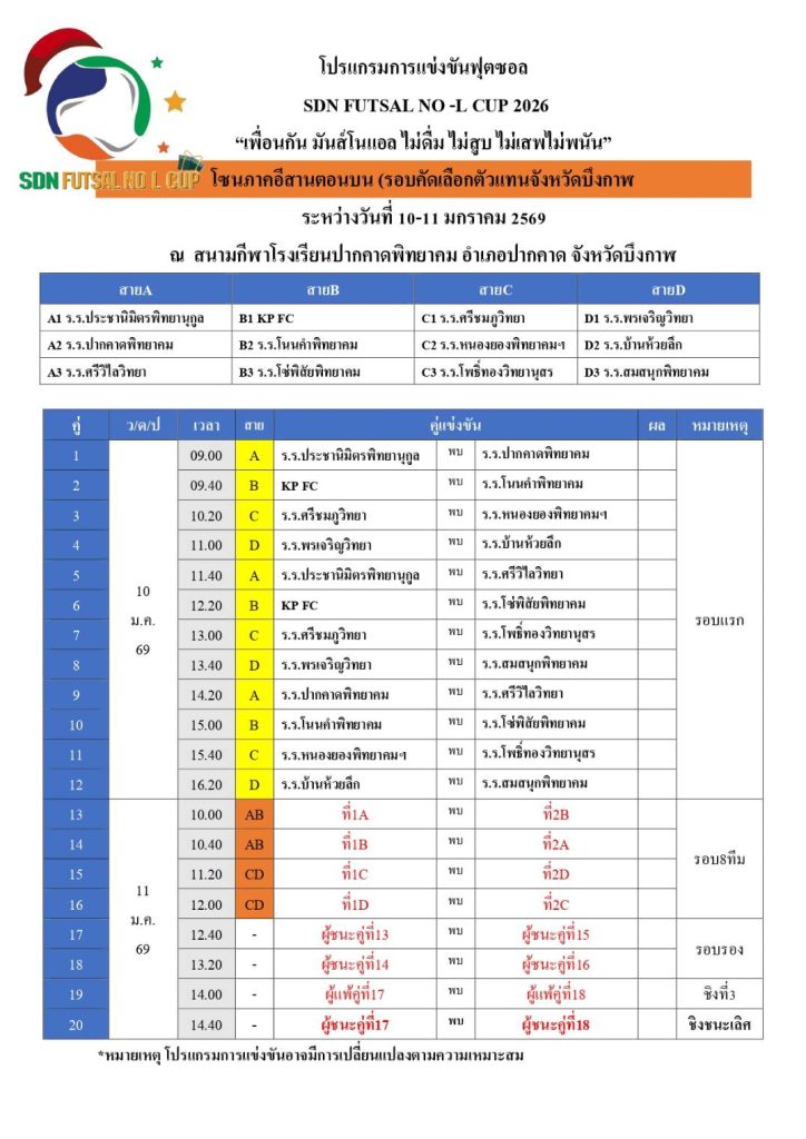 “เพื่อนกันมันสโนแอล” (ไม่ดื่ม ไม่สูบ ไม่เสพ ไม่พนัน) ระดับจังหวัด รุ่นอายุไม่เกิน 15 ปี ประจำปี 2569 ณ สนามฟุตซอลโรงเรียนปากคาดพิทยาคม อำเภอปากคาด จังหวัดบึงกาฬ