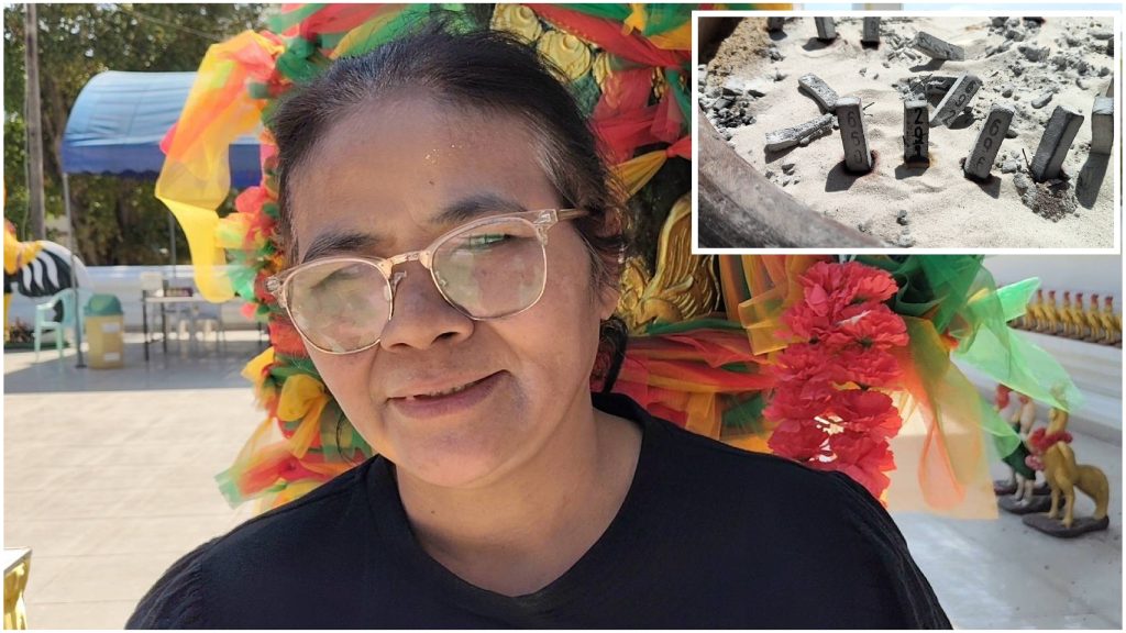 ด้านคุณยายเพ็ญ วันเพ็ญ ใจสุวรรณ อายุ 78 ปี ผู้ที่ติดตามข่าวจากสถานีโทรทัศน์ไทยรัฐทีวี เดินทางมาจากย่านบางใหญ่ จังหวัดนนทบุรี เพื่อมาขอพรไอ้ไข่วัดบึงบา โดยคุณยายเพ็ญเล่าว่า ได้ทราบข่าวจากไทยรัฐทีวีว่าไอ้ไข่วัดบึงบาให้โชคแก่ผู้มาขอพรจนถูกรางวัลสลากกินแบ่งรัฐบาลมาแล้วหลายราย เมื่อได้เห็นข่าวจึงเกิดความศรัทธาและตัดสินใจเดินทางมาขอพรด้วยตนเอง เมื่อเดินทางมาถึง คุณยายเพ็ญรู้สึกประทับใจกับบรรยากาศภายในวัดที่สะอาด ร่มรื่น รวมถึงพญานาคที่ประดับอยู่ริมทางเดินซึ่งมีความสวยงาม ทำให้เกิดความศรัทธายิ่งขึ้น สำหรับการมาครั้งนี้คุณยายเพ็ญได้ตั้งจิตอธิษฐานขอพรให้ถูกรางวัลเลขท้าย 3 ตัว และหากเป็นไปได้ก็ขอให้ถูกรางวัลที่ 1 และหากสมปรารถนา ตนจะกลับมาทอดผ้าป่าหรือทอดกฐินถวายวัด แต่หากถูกรางวัลเพียงเลขท้าย 3 ตัว ก็จะซื้อนาฬิกาข้อมือมาถวายไอ้ไข่วัดบึงบา นอกจากนี้ ก่อนเดินทางกลับ คุณยายเพ็ญยังได้ลองลุ้นโชคโดยการล้วงลูกบอลจากไหทองคำได้เลข 605 เพื่อนำไปลุ้นโชคในการออกรางวัลงวดที่จะถึงนี้อีกด้วย