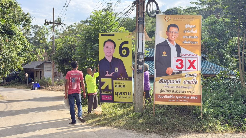 ยะลา ทีมงานผู้สมัครเร่งติดตั้งป้ายหาเสียงทั่วเมืองเบตง