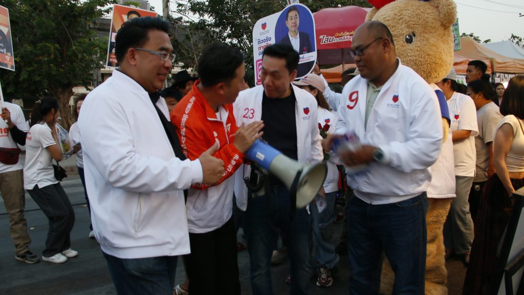 โอกาสนี้ที่กำลังเดินเข้าไปยังร้านค้าถนนคนเดิน ทางนายอัครนันท์ กัณณ์กิตตินันท์ หรือ สส.กอล์ฟ ผู้สมัครพรรคเพื่อไทย พร้อมทีมงานได้เดินพบปะประชาชนในถนนคนเดินจนเสร็จภารกิจ เมื่อพบเห็นหัวหน้าพรรคปวงชนไทย พร้อมทีมงาน สส.กอล์ฟ พร้อมทีมงาน จึงได้พากันเดินทางออกจากบริเวณถนนคนเดินกลับออกไปทันที และคณะของพรรคปวงชนไทย ได้เดินไปพบกับ นายภูวนาถ รัศมีฤกษ์เศรษฐ์ พร้อมทีมงานผู้สมัครของพรรคประชาชน ได้ทำการทักทายจับมือต่างแสดงความยินดีต่อกัน ทำให้บรรยากาศชื่นมื่นยิ่งนัก พร้อมกล่าวว่า “เราไม่แตกต่างกันมีสินค้าออกมาให้ประชาชนเลือกซื้อ ต้องแล้วแต่ประชาชนจะเลือกซื้อของใคร” จากนั้นก็ได้เดินออกพบปะประชาชนจนสิ้นสุดถนนคนเดินซึ่งตั้งร้านค้าเกือบ 500 ร้านค้า ระยะทางกว่า 1 กิโลเมตร มีประชาชนไปเดินกันแน่นคึกคักมากๆ