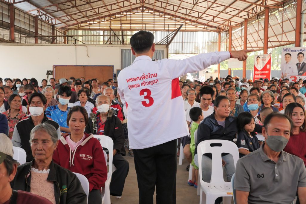 นายรุ่งเพชร ผู้สมัครพรรคเพื่อไทย กล่าวว่าพรรคเพื่อไทย มีนโยบายที่ดลใจและบอกพี่น้องประชาชนทั่วประเทศว่าพรรคเพื่อไทย ทำได้ ทำเพื่อการแก้ไขปัญหาชีวิตให้กับพี่น้อง สิ่งแรกคือการปลดหนี้ เพราะหนี้สินคือโซ่ตรวนที่รัดขาพี่น้องประชาชน ทำให้ไม่สามารถเดินหน้า ลุกขึ้นยืนได้ ด้วยการล้างหนี้ประชาชนอาทิ ปลดหนี้เสียที่ไม่เกิน 200,000 บาท ล้างหนี้วัยเกษียณ ผู้สูงอายุเกินกว่า 60 ปี เป็นหนี้รัฐไม่เกิน 100,000 บาท ก็จะยกหนี้ให้เลย พี่น้องเกษตรกรที่เป็นหนี้ จะพักหนี้ให้ 3 ปี วงเงิน 500,000 บาท พักทั้งต้น พักทั้งดอก ล้างหนี้นอกระบบ ปล่อยกู้ดอกเบี้ยต่ำเพื่อปิดหนี้นอกระบบ รายละ 50,000 บาท แจกคูปองให้พี่น้องเกษตรกรคนละ 2 ใบ ใบแรก เอาไว้แลกปุ๋ยได้ 250 กิโลกรัม ใบที่สองเอาไว้แลกเมล็ดพันธุ์ 150 กิโลกรัม