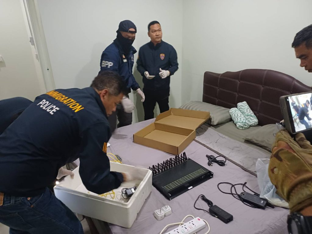 จากนั้น พ.ต.ท.อภิชาติ คลธา สว.ตม.จว.หนองคาย จึงได้รายงายให้ พ.ต.อ.นพดล รักชาติ ผกก.ตม.จว.หนองคาย ทราบ จึงพร้อมด้วยเจ้าหน้าที่ชุดสืบสวน ตม.หนองคาย ได้เดินทางเข้าตรวจสอบ พบ นายวีระศักดิ์ (ขอสงวนนามสกุล) อายุ 66 ปี สัญชาติไทย ซึ่งเป็นเจ้าของรีสอร์ท ซึ่งเป็นผู้แจ้งให้เจ้าหน้าที่ทราบ เข้าตรวจสอบห้องพักหมายเลข 8 ไม่พบผู้ที่เข้าพัก แต่ภายในห้องพักถูกดัดแปลงโดยนำสายไฟขึ้นไปบนฝ้าเพดานของห้อง เจ้าหน้าที่ได้เปิดแผ่นฝ้าเพดานออก พบสายไฟดังกล่าวได้เชื่อมต่อกับเครื่องซิมบ็อกซ์ (SIM BOX) 3 เครื่อง,เครื่องรับและกระจายสัญญาณอินเทอเน็ตแบบไร้สาย จำนวน 2 พร้อมอุปกรณ์สาย adaptor 3 ตัว ซึ่งแต่ละเครื่องสามารถใส่ซิมได้ 32 ซิม และปลั๊กไฟพ่วง 1 ตัว และไม่มีผู้ใดมาแสดงตนเป็นเจ้าของ จึงได้ตรวจยึดเพื่อทำการตรวจสอบ