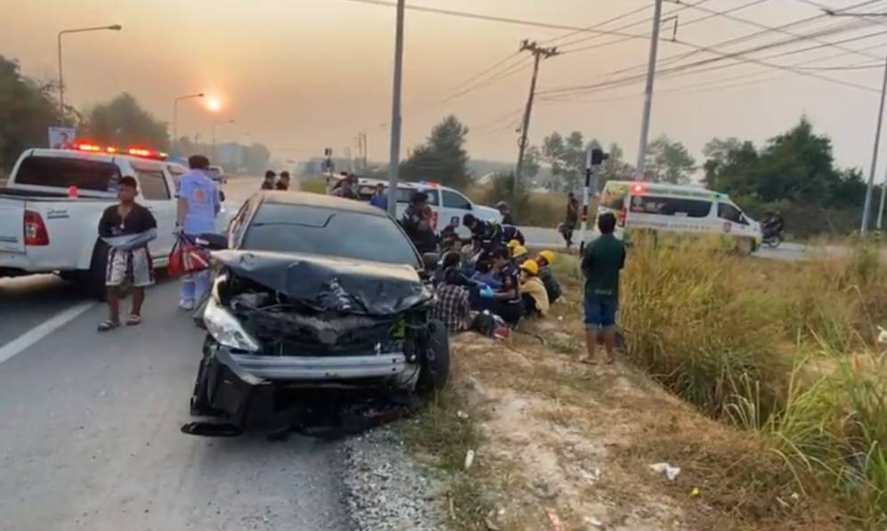 เกิดเหตุรถสองแถว รับ-ส่งแรงงานสัญชาติเมียนมาร์ เฉี่ยวชนรถเก๋งบริเวณสี่แยกถนนซอย 6 สาย 11 อ.นิคมพัฒนา จ.ระยอง เจ็บ 30 ราย