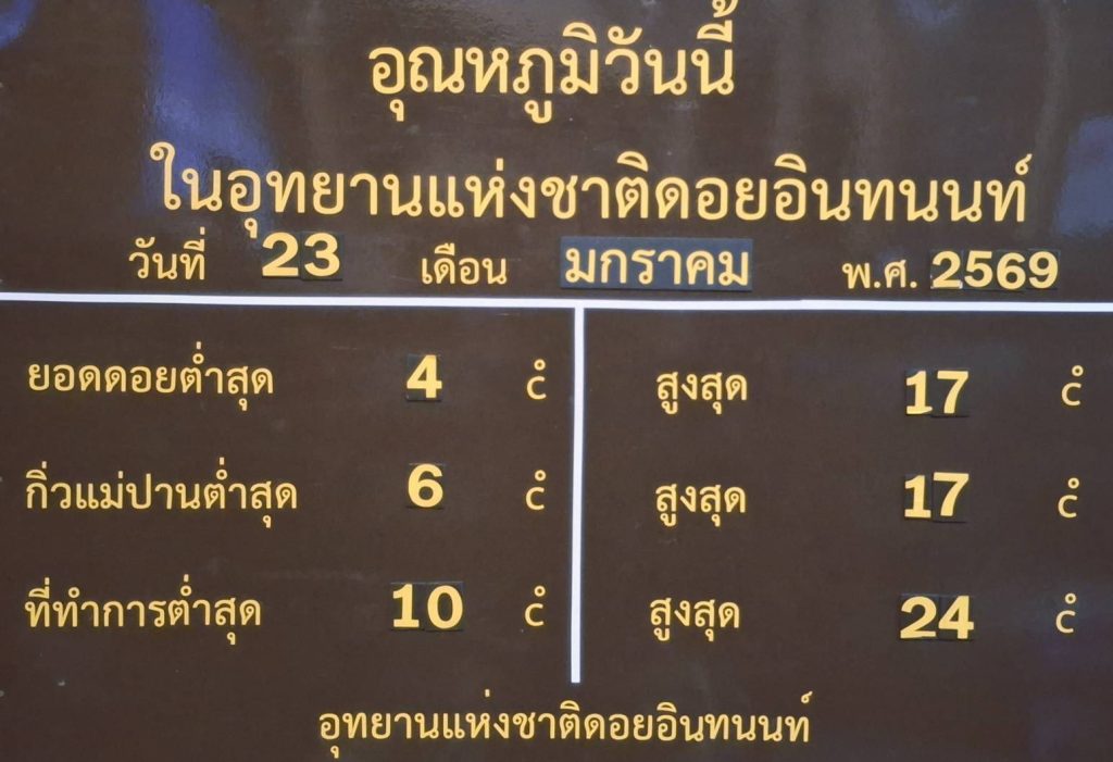 เมื่อเวลา 08.30 น วันที่ 23 มค 69 ทางอุทยานแห่งชาติดอยอินทนนท์ อ จอมทองเชียงใหม่ โดยนายจีรนิติ เชิงสะอาด หัวหน้าอุทยานแห่งชาติดอยอินทนนท์ ได้รายงานว่า อุณหภูมิที่ดอยอินทนนท์ จุดยอดดอยวัดได้ 4 องศา ที่กิ่่วแม่ปานวัดได้ 6 องศา ที่ทำการอุทยานฯ วัดได้ 10 องศา เกิดเหมยขาบเป็น ครั้งที่ 38 ของฤดูหนาวนี้ อุณหภูมิต่ำสุด 4 องศาเซลเซียส ณ หน่วยพิทักษ์อุทยานแห่งชาติดอยอินทนนท์ อน.5 (ยอดดอย) – พบเหมยขาบ,แม่คะนิ้งบริเวณ หน้าหน่วย อน. 5 ยอดดอย และลานจอดรถ อุณหภูมิยอดหญ้าติดลบ -0.8 องศา เหมยขาบเกาะเต็มแผ่นไม้ รวมทั้งรถยนต์ที่จอดในโรงจอดรถหน่วยพิทักษ์ เหมยขาบเกาะเต็มหลังคา รวมทั้งกระจกหน้าหลัง ฝากระโปรงรถ วันนี้นักท่องเที่ยวยังคงคึกคัก ขึ้นมาสัมผัสอากาศหนาว ชมแสงอาทิตย์ยามเช้าตัดกับเมฆ และชมทะเลหมอก จุดชมวิวกิ่วแม่ปาน ชมศึกษาธรรมชาติในเขตอุทยานแห่งชาติดอยอินทนนท์ มีจุดให้ชมและบันทึกภาพหลายจุด