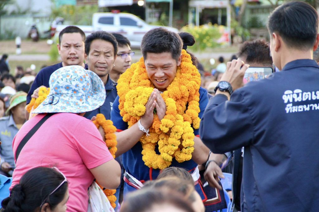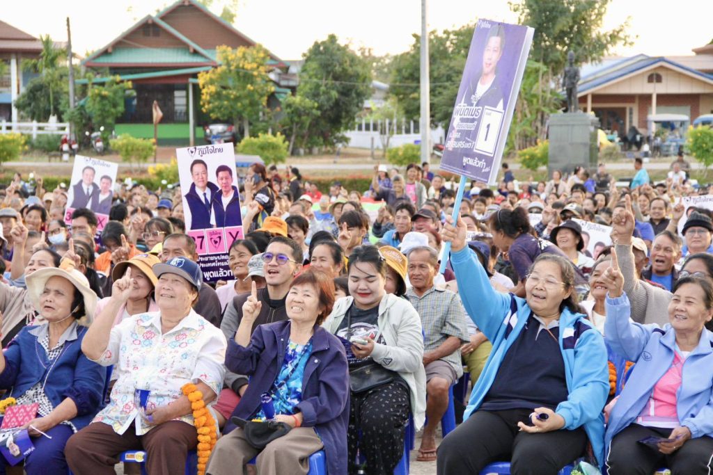 ครูต่าง ชัยมงคล ไชยรบ อดีต ส.ส.สกลนคร เขต 5 นำทัพปราศรัยเรียกคะแนนจากชาวบ้านใน เขต 1 ให้เลือกพินิตเมธ ทีฆธนานนท์ ลูกชายโกมุท ทีฆธนานนท์ นายก ทน.สกลนคร เป็น ส.ส เพื่อให้อนุทินนั่งนายกฯ