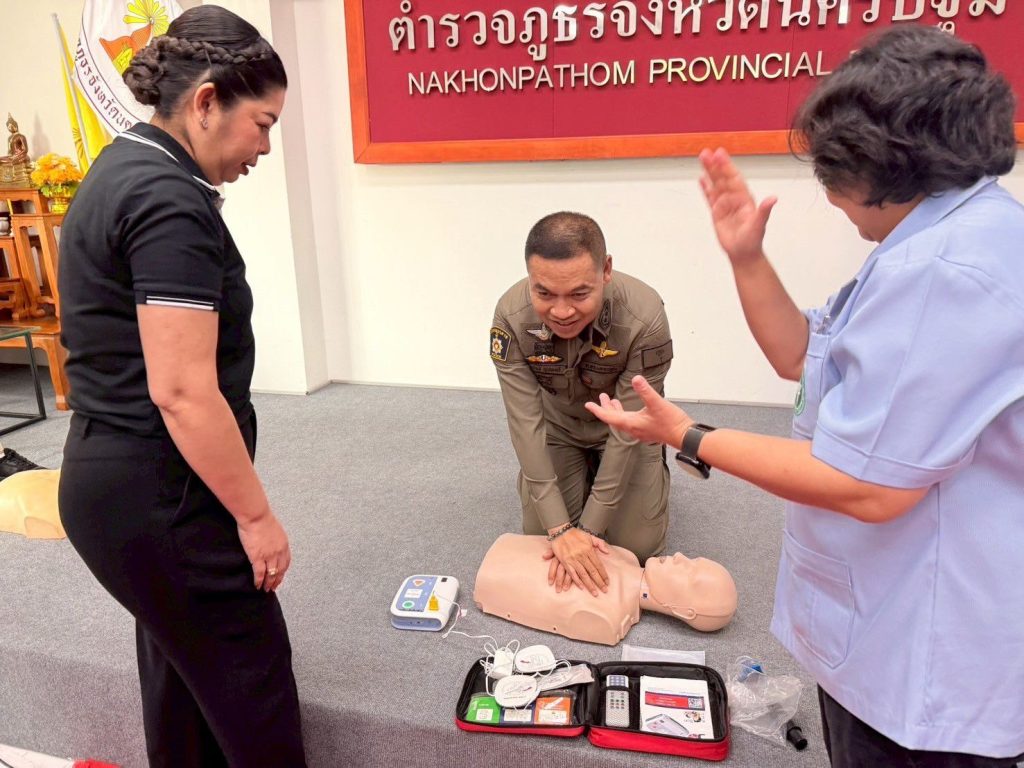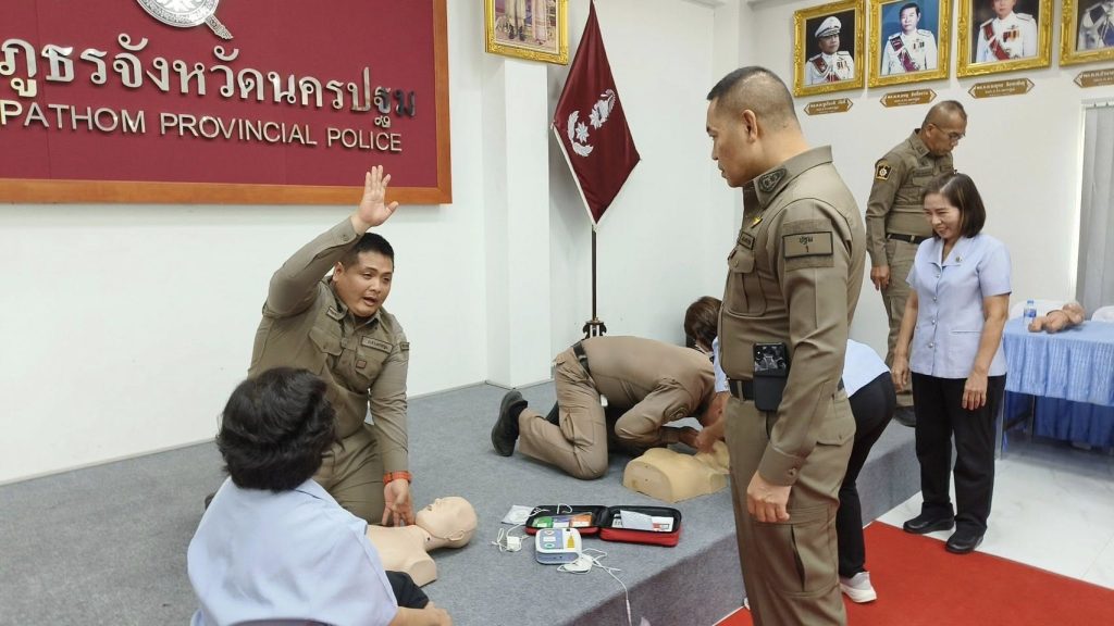 พล.ต.ต.พิทักษ์ อุปพงษ์ ผบก.ภ.จว.นครปฐม เผยว่า สำหรับโครงการฝึกอบรมเชิงปฏิบัติการปฐมพยาบาลเบื้องต้นและการกู้ชีพขั้นพื้นฐาน (CPR) ประจำปี 2569 จัดขึ้นเพื่อเสริมสร้างความรู้ ความเข้าใจ และทักษะด้านการปฐมพยาบาลและการช่วยฟื้นคืนชีพขั้นพื้นฐานให้แก่ข้าราชการตำรวจให้เจ้าหน้าที่สามารถดูแลความปลอดภัยและช่วยเหลือประชาชนและช่วยเหลือเจ้าหน้าที่ด้วยกัน ได้อย่างทันท่วงที เพื่อให้มีความพร้อมในการช่วยเหลือผู้ประสบเหตุฉุกเฉินและผู้ได้รับบาดเจ็บ ในการประเมินผู้ป่วย การห้ามเลือด การจัดการบาดแผล การทำ CPR, และการใช้เครื่อง AED. สามารถนำความรู้ไปใช้ในการปฏิบัติหน้าที่ได้อย่างถูกต้อง ทันท่วงที และมีประสิทธิภาพ