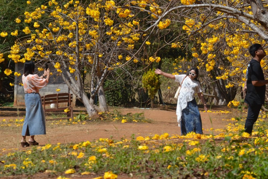 ฤดูท่องเที่ยวปีนี้อบอวลไปด้วยสีเหลืองทองของ “ดอกสุพรรณิการ์” หรือ ดอกฝ้ายคำ ที่ไร่โกฟ้า บ้านมุง อำเภอเนินมะปราง จังหวัดพิษณุโลก หลังดอกไม้แห่งความเป็นสิริมงคลบานสะพรั่งเต็มพื้นที่ ท่ามกลางฉากหลังของเขาหินปูนสูงตระหง่านราวภาพวาดธรรมชาติ นักท่องเที่ยวหลั่งไหลมาถ่ายภาพเช็กอินกันอย่างคึกคัก