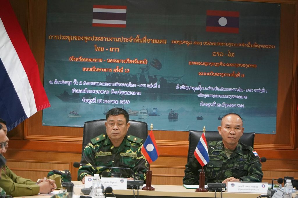 วันที่ 28 ม.ค.69 ณ ห้องประชุมชั้น 2 ด่านพรมแดนสะพานมิตรภาพไทย - ลาว แห่งที่ 1 (ขาออก) อำเภอเมืองหนองคาย จังหวัดหนองคาย พลตรี มงคล หอทอง ผู้บัญชาการกองกำลังสุรศักดิ์มนตรี/หัวหน้าชุดประสานงานประจำพื้นที่ชายแดนไทย – ลาว ร่วมกับ พลจัตวาบุนลิด สีสุพอน หัวหน้าการทหาร กองบัญชาการทหาร นครหลวงเวียงจันทน์ สปป.ลาว เป็นประธานการประชุมชุดประสานงานประจำพื้นที่ชายแดนไทย - ลาว (หนองคาย-นครหลวงเวียงจันทน์)