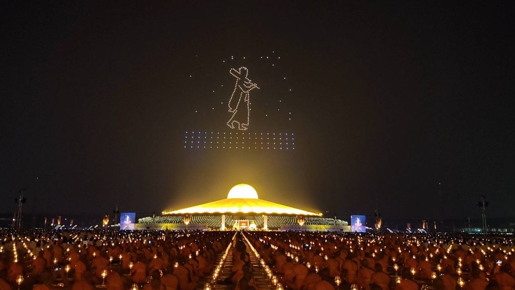 ปทุมธานี โดรนแปรอักษรและภาพที่เนื่องกับอนุสรณ์สถานทั้ง 7 แห่งส่งท้ายโครงการฯ พระธรรมยาตราพันกว่ารูปจุดประทีปถวายเป็นพุทธบูชา อนุสรณ์สถาน