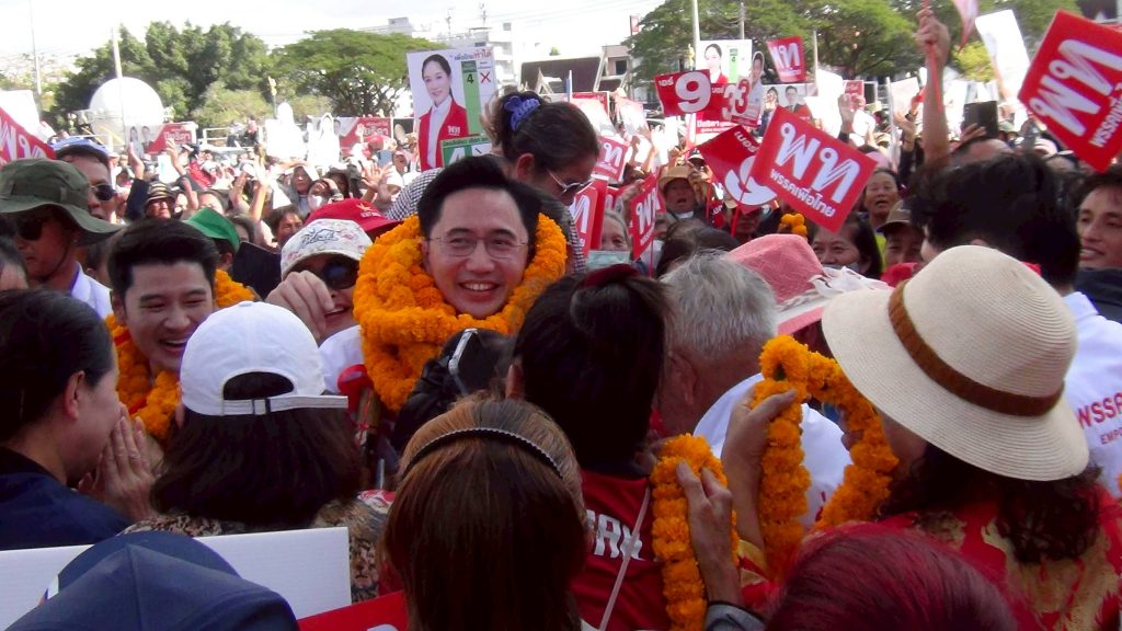 สำหรับบรรยากาศที่เวทีช่วยหาเสียงของพรรคเพื่อไทย ศ.ดร.ยศชนัน วงศ์สวัสดิ์ แคนดิเดตนายก และคณะมาถึงได้เดินทักทายประชาชน และประชาชนได้คล้องมาลัยดอกดาวเรือง ตระกร้าสาน กระติ้บข้าว และมะขามหวาน