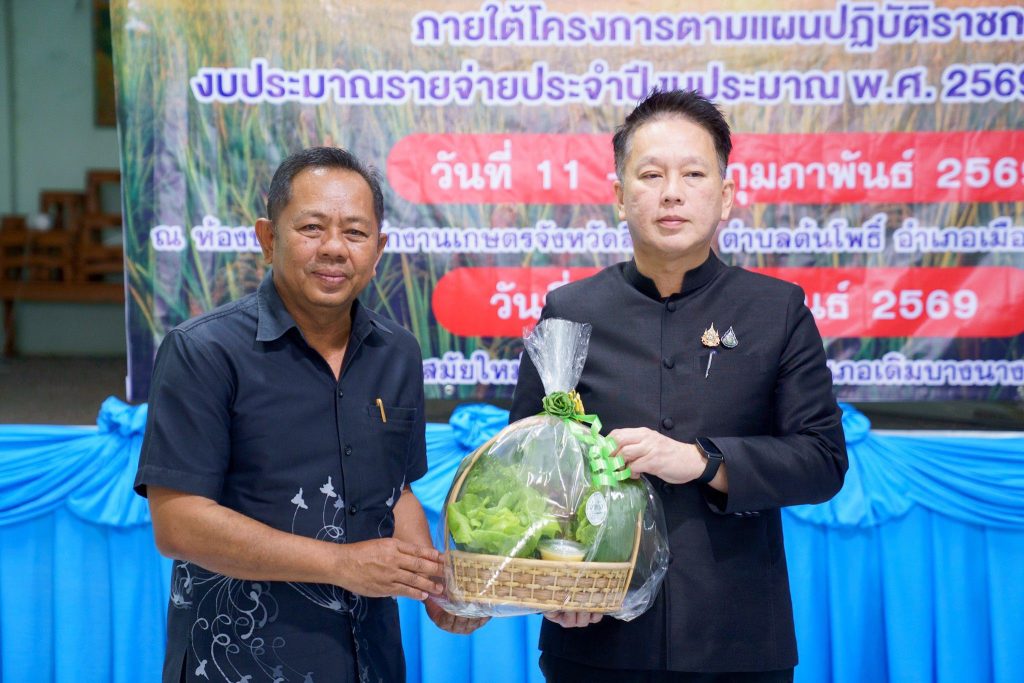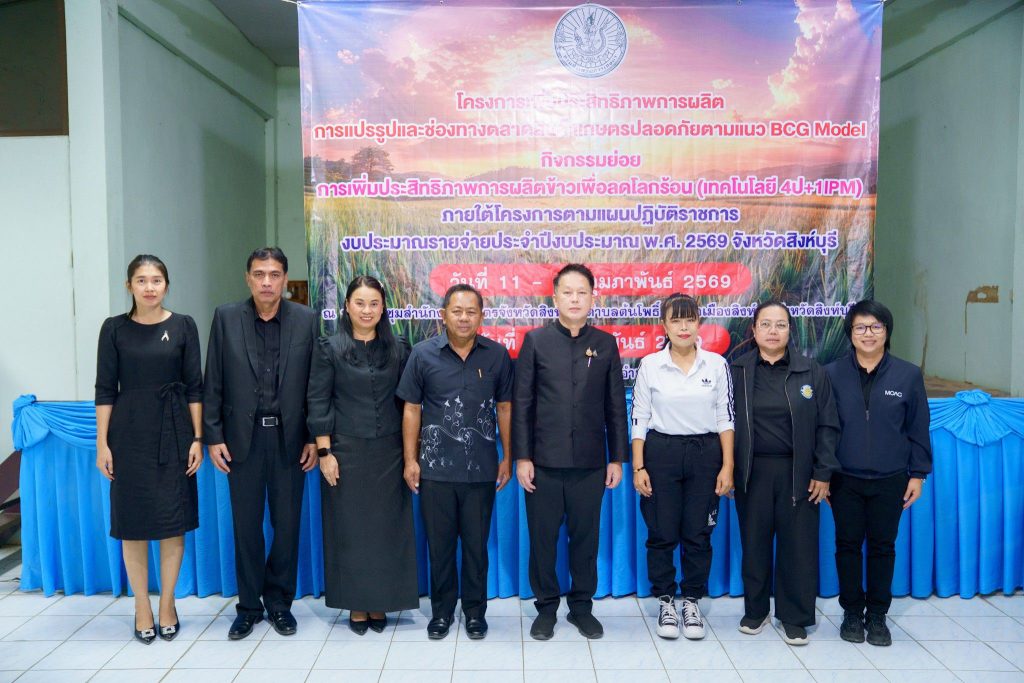 วันพุธที่ 11 กุมภาพันธ์ 2569 นายสหชัย แจ่มประสิทธิ์สกุล รองผู้ว่าราชการจังหวัดสิงห์บุรี เป็นประธานเปิดกิจกรรมการเพิ่มประสิทธิภาพการผลิตข้าวเพื่อลดโลกร้อน (เทคโนโลยี 4 ป + 1 IPM) ภายใต้โครงการเพิ่มประสิทธิภาพการผลิต การแปรรูป และช่องทางตลาดสินค้าเกษตรตามแนว BCG Model