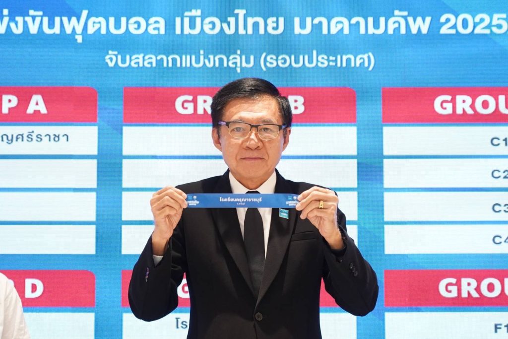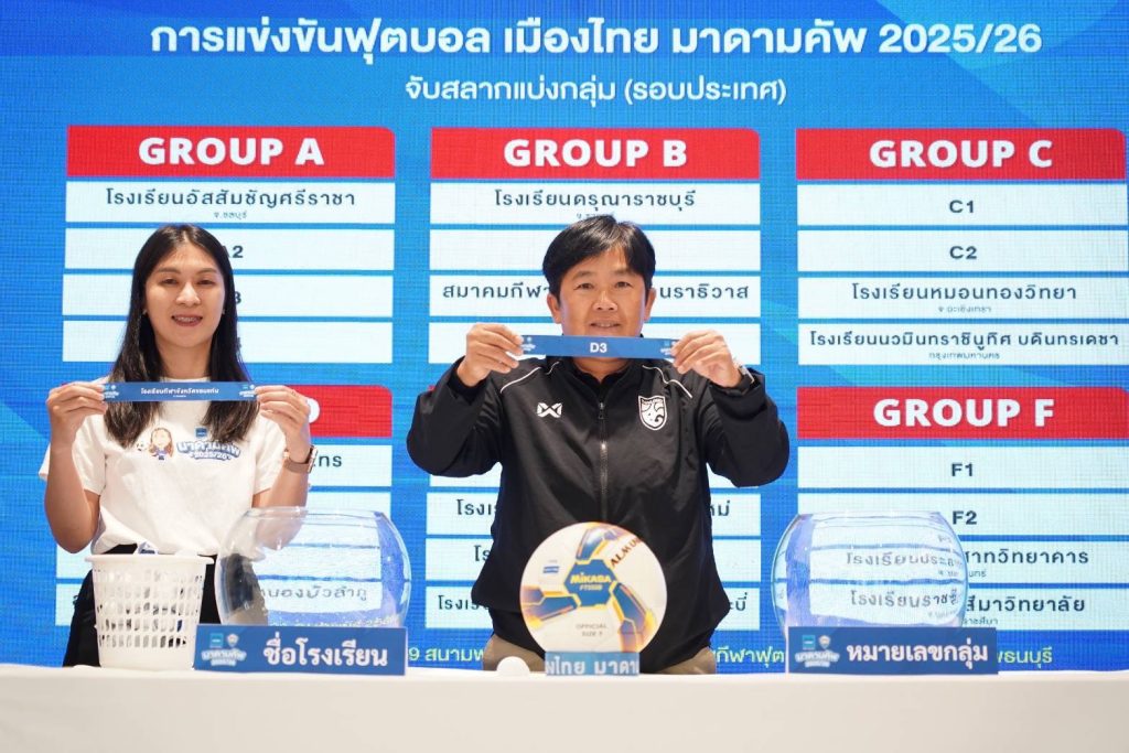 การแข่งขัน ฟุตบอลเยาวชน 7 คน “เมืองไทย มาดามคัพ 2025/26” เข้าสู่ช่วงโค้งสุดท้ายกันแล้ว ล่าสุดมีการจับสลากรอบแบ่งกลุ่ม รอบประเทศจำนวน 24 ทีมออกมาเป็นที่เรียบร้อย ภายใต้รูปแบบการแข่งขัน ทั้งหมด 6 กลุ่ม กลุ่มละ 4 ทีม นำทีมแชมป์กลุ่มทั้ง 6 กลุ่ม และ ทีมอันดับ 2 ผลงานดีที่สุด 2 ทีม ผ่านเข้าสู่รอบ 8 ทีมสุดท้ายต่อไป