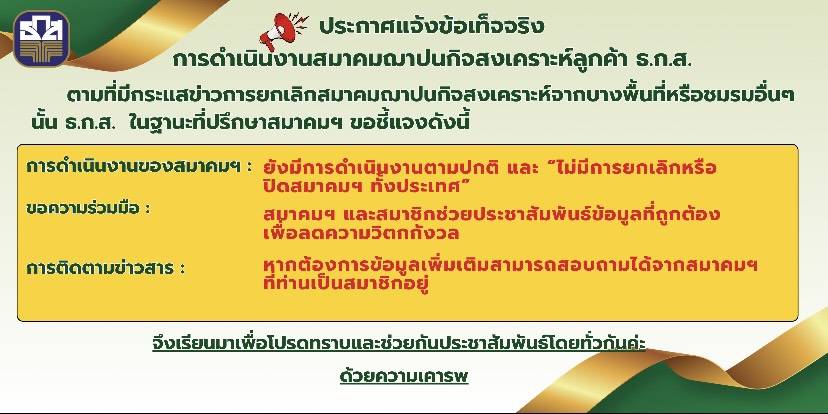 ธ.ก.ส.สุพรรณบุรี ขอยืนยันว่าสมาคมฌาปนกิจสงเคราะห์ลูกค้า ธ.ก.ส.จังหวัดสุพรรณบุรี ยังคงมีความเข้มแข็งและสามารถดำเนินงานได้ตามปกติ จึงขอแจ้งให้สมาชิกสมาคมฌาปนกิจสงเคราะห์ลูกค้า ธ.ก.ส.จังหวัดสุพรรณบุรี ทุกรายทราบว่าสมาคมณาปนกิจสงเคราะห์ลูกค้า ธ.ก.ส.จังหวัดสุพรรณบุรี ไม่ได้ยุติการดำเนินงาน (ไม่ได้ยุบ) ตามที่มีการเผยแพร่ข้อมูลผ่านสื่อสังคมออนไลน์ หากสมาชิกหรือครอบครัวของสมาชิกฯ มีข้อสงสัยเกี่ยวกับการดำเนินงานของสมาคมฌาปนกิจสงเคราะห์ลูกค้า ธ.ก.ส.จังหวัดสุพรรณบุรี สามารถติดต่อสอบถาม ข้อมูลเพิ่มเติมได้ที่ “สมาคมฌาปนกิจสงเคราะห์ลูกค้า ธ.ก.ส.” ที่เป็นสมาชิกได้โดยตรง