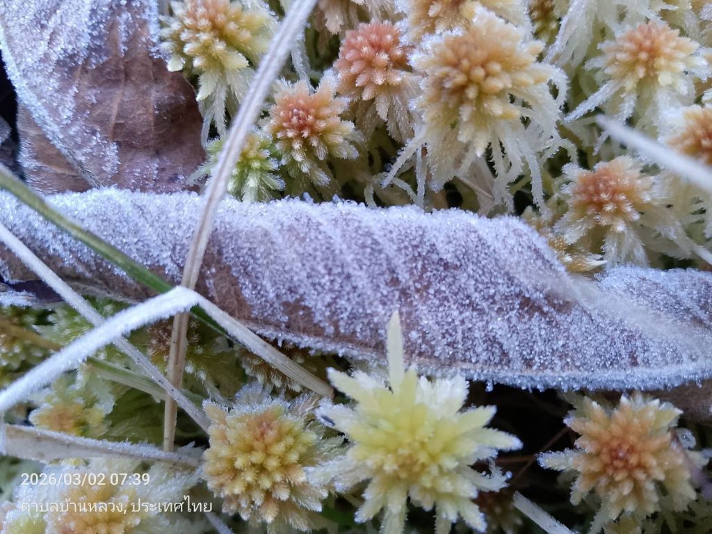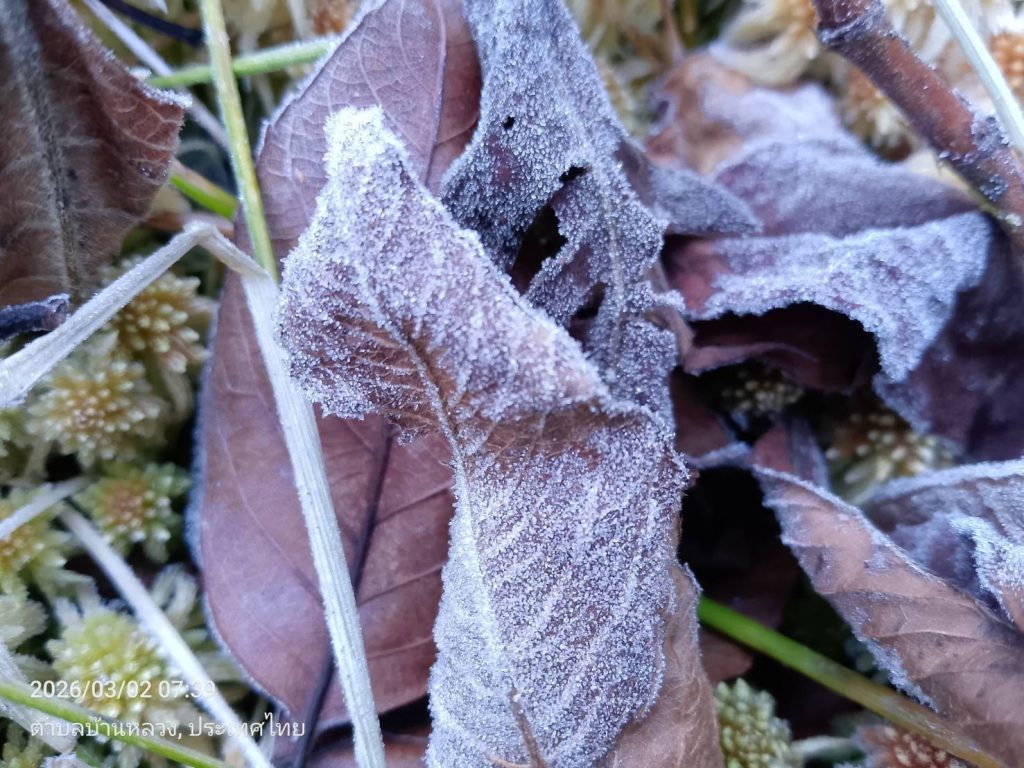 อากาศหนาวอีกครั้งอุณหภูมิลดลง ต่ำสุด 4 องศา อุณหภูมิยอดหญ้าติดลบ -0.3 องศา เกิดเหมยขาบข้างทางและเส้นทางศึษาธรรมชาติอ่างกา และน้ำค้างแข็งเกาะยอดหญ้าหลายจุด