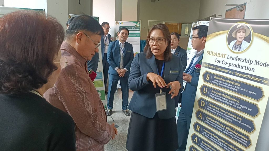 จากนั้นนักศึกษาโชว์ผลงานวิชาการ “Poster Presentation” เชื่อมทฤษฎีสู่ปฏิบัติ ส่วนไฮไลต์สำคัญของงานคือการนำเสนอผลงานเชิงแนวคิด (Conceptual Framework) ของนักศึกษาปริญญาเอก รุ่นที่ 18 ในรูปแบบ Poster presentation ที่รวบรวมรูปแบบผู้นำที่สัมฤทธิผลในการพัฒนาหลากหลายมิติ ซึ่งถือเป็นการฝึกทักษะการวิเคราะห์และสังเคราะห์องค์ความรู้เชิงยุทธศาสตร์แบบเข้มข้น กระบวนการนี้ไม่เพียงแต่เป็นการนำเสนอทางวิชาการ แต่ยังเป็นการฝึก การคิดเชิงยุทธศาสตร์ (Strategic Thinking) และการทำงานร่วมกันอย่างมีส่วนร่วม