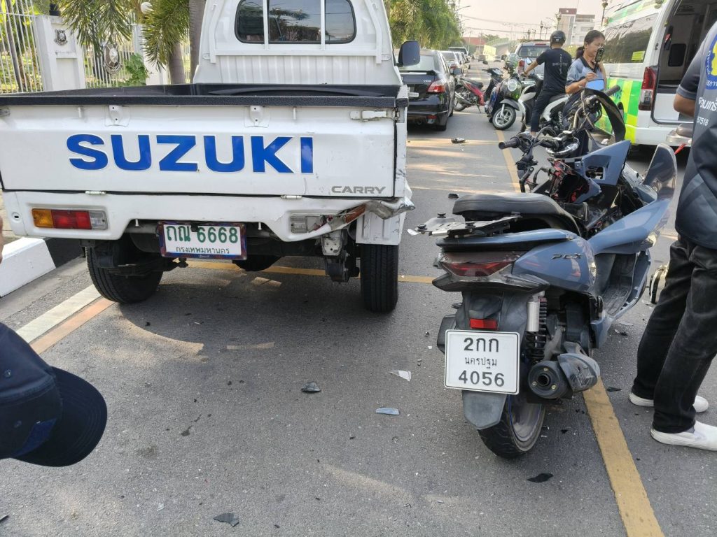 ที่เกิดเหตุ พบรถกระบะซูซูกิ สีขาว ทะเบียน ถณ 6668 กทม จอดอยู่ช่องทางด้านซ้าย ท้ายรถ ด้านขวามีรอยเฉียวชน และ พบรถจักรยานยนต์ honda PCX สีเทาทะเบียน 2 กก 4056 นครปฐม สภาพ พังยับเยิน ทั้งคัน