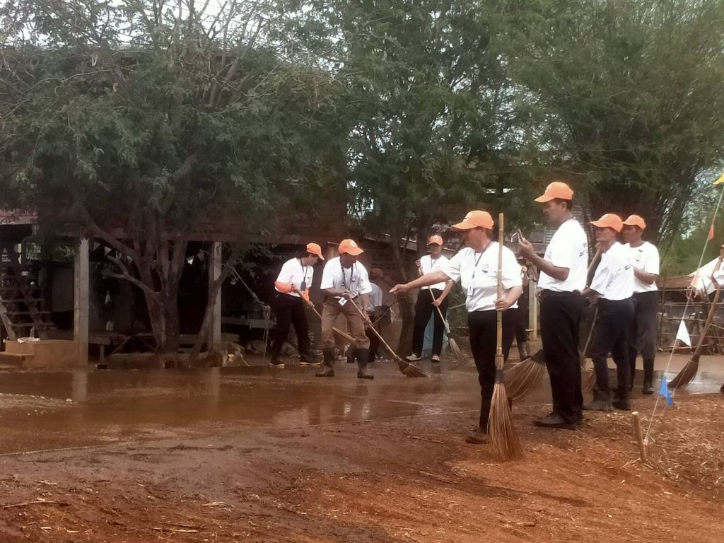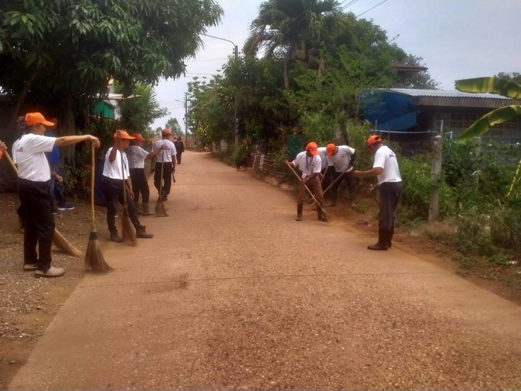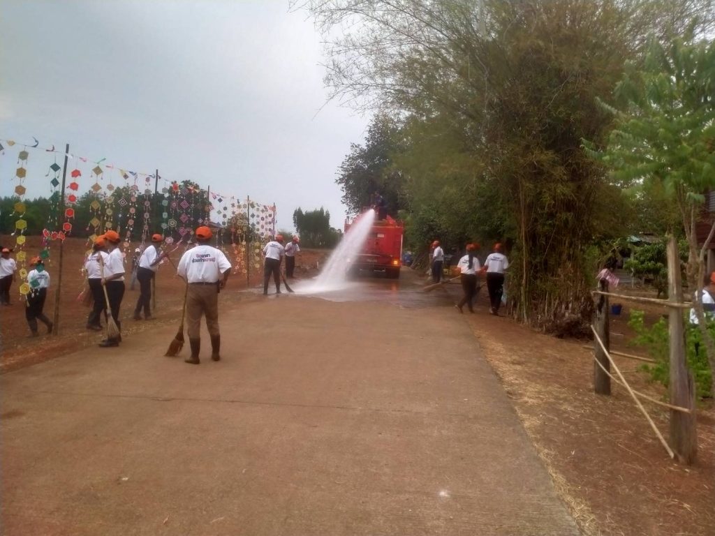 ทำความสะอาดถนนคอนกรีตเสริมเหล็กทางเข้าสถานที่จัดงาน จัดเตรียมผลไม้ ได้แก่ แตงโม ส้มเขียวหวาน และส้มโอ เพื่อแจกให้สมาชิกและชาวบ้านที่มาร่วมทำบุญ