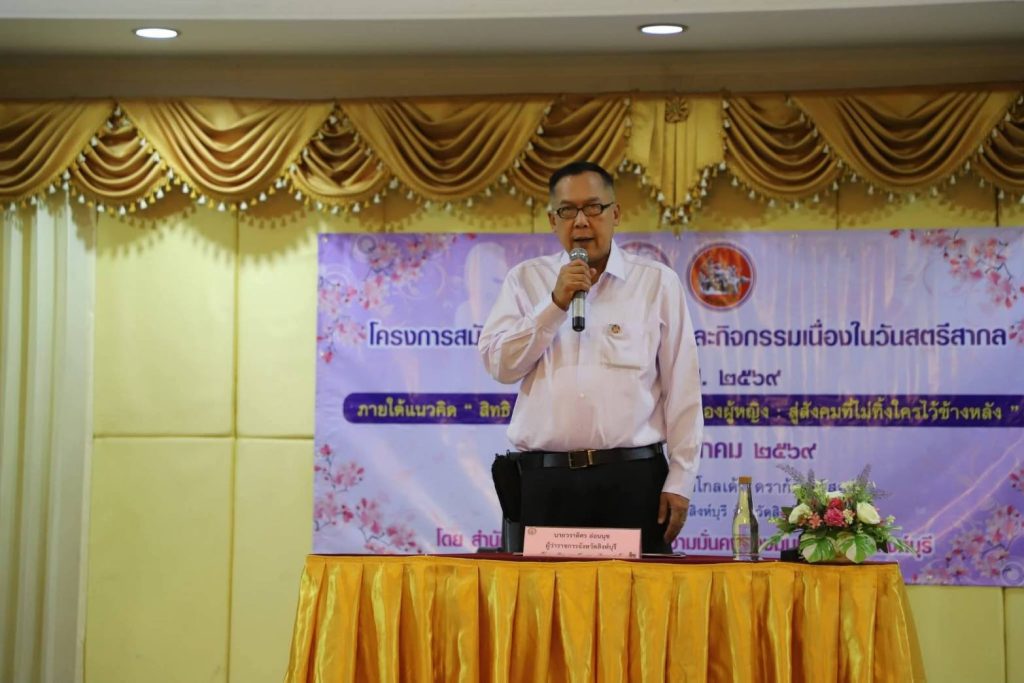 วันที่ 13 มีนาคม 2569 เวลา 9.00 น.นายวราดิศร อ่อนนุช ผู้ว่าราชการจังหวัดสิงห์บุรีเป็นประธานในพิธีเปิดโครงการสมัชชาสตรีระดับจังหวัดและกิจกรรมเนื่องในวันสตรีสากล ประจำปี พ.ศ. 2569 ภายใต้แนวคิด “สิทธิ ความยุติธรรม และเสียงของผู้หญิง : สู่สังคมที่ไม่ทิ้งใครไว้ข้างหลัง” เพื่อรวมพลังสตรีและภาคีเครือข่ายในการขับเคลื่อนความเท่าเทียมในสังคม ณ ห้องราชาวดี ชั้น 5 โรงแรมโกลเด้น ดราก้อน รีสอร์ท จังหวัดสิงห์บุรี
