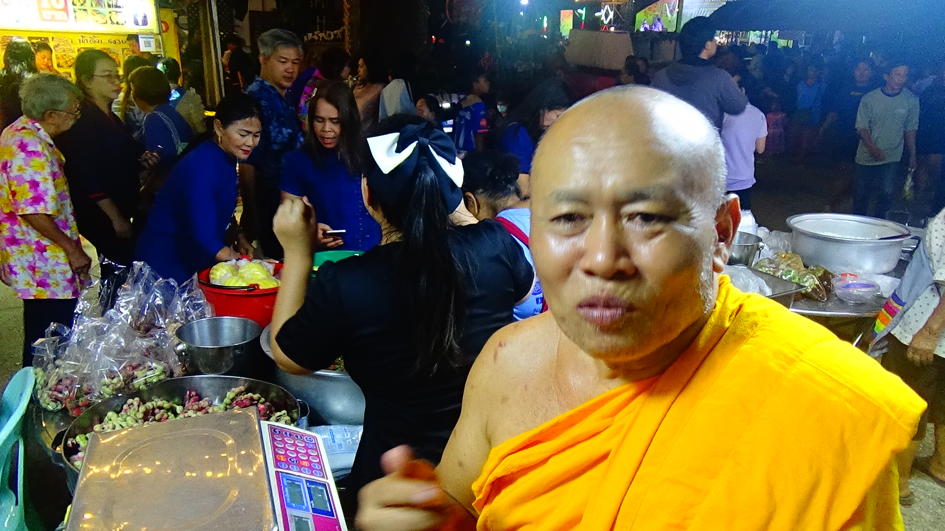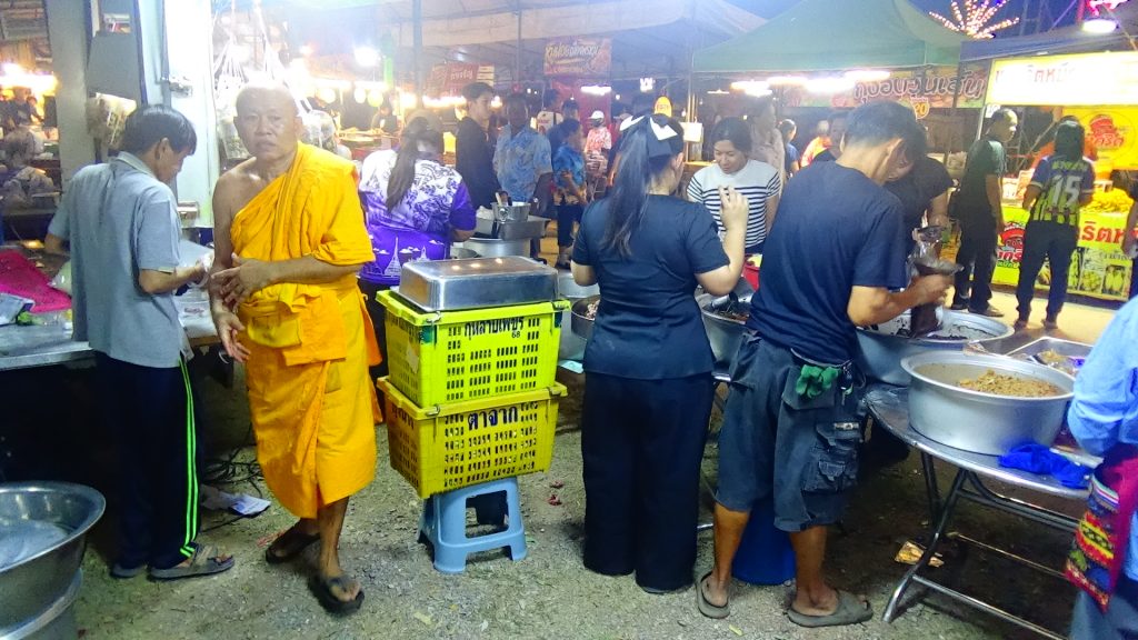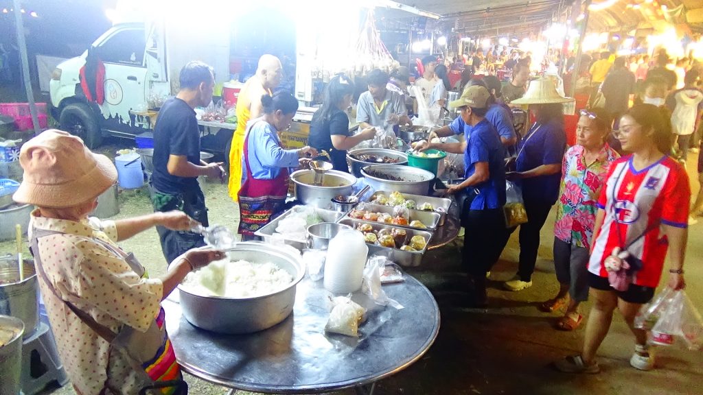ในงาน สักการะท้าวมหาพรหม ชมเบญจมาศทุ่งสาน สืบสานตำนานพรหมวิถี “ ของดีเมืองพรหม ” ที่ อำเภอพรหมพิราม จ.พิษณุโลก ที่กำลังจัดในบริเวณหน้าที่ว่าการอำเภอพรหมพิรามอยู่ในขณะนี้ ปรากฏว่า ในมุมหนึ่งของงาน ก็ยังได้มีการจัดกิจกรรมเป็นงานบุญ นำโดย พระครูอุภัยโกศล หรือ ” หลวงพี่ช้าง ” เจ้าอาวาสวัดกรับพวงเหนือ และเจ้าคณะ อ.พรหมพิราม จ.พิษณุโลก ซึ่งท่านก็มีชื่อเสียงอยู่แล้วในด้านของการเป็นพระนักพัฒนา ได้รับความเลื่อมใสศรัทธา จากพุทธศาสนิกชนมากมาย โดยเฉพาะบทบาทการช่วยเหลือสังคม ในช่วงหัวค่ำของวันนี้ก็ยังเดินหน้าไม่หยุด เป้าหมายขณะนี้คือ คณะสงฆ์ อ.พรหมพิราม กำลังระดมทุนเพื่อก่อสร้างห้องเจาะเลือด และห้องพักของผู้ป่วย ให้แก่ โรงพยาบาลพรหมพิราม ซึ่งมีมูลค่ามากกว่า 2 แสนบาท จึงได้นำคณะสงฆ์ของวัด และคณะสงฆ์ จาก อ.แม่วาง อ.แม่ริม จ.เชียงใหม่ ที่มาศึกษาดูงาน พร้อมพุทธศาสนิกชนจิตอาสา ที่เดินผ่านไปมาในงาน มาทำการประกอบอาหารหวานคาว ที่วัตถุดิบส่วนใหญ่ได้มาจากการบริจาค จากนั้นใส่ถุงจำหน่ายในราคาเพียงถุงละ 30 บาท ขนาดจุเต็มถุง กินอิ่มกันทั้งบ้าน แถมได้บุญ ส่วนใครไม่มีข้าวกิน มากินฟรีได้เลย …..