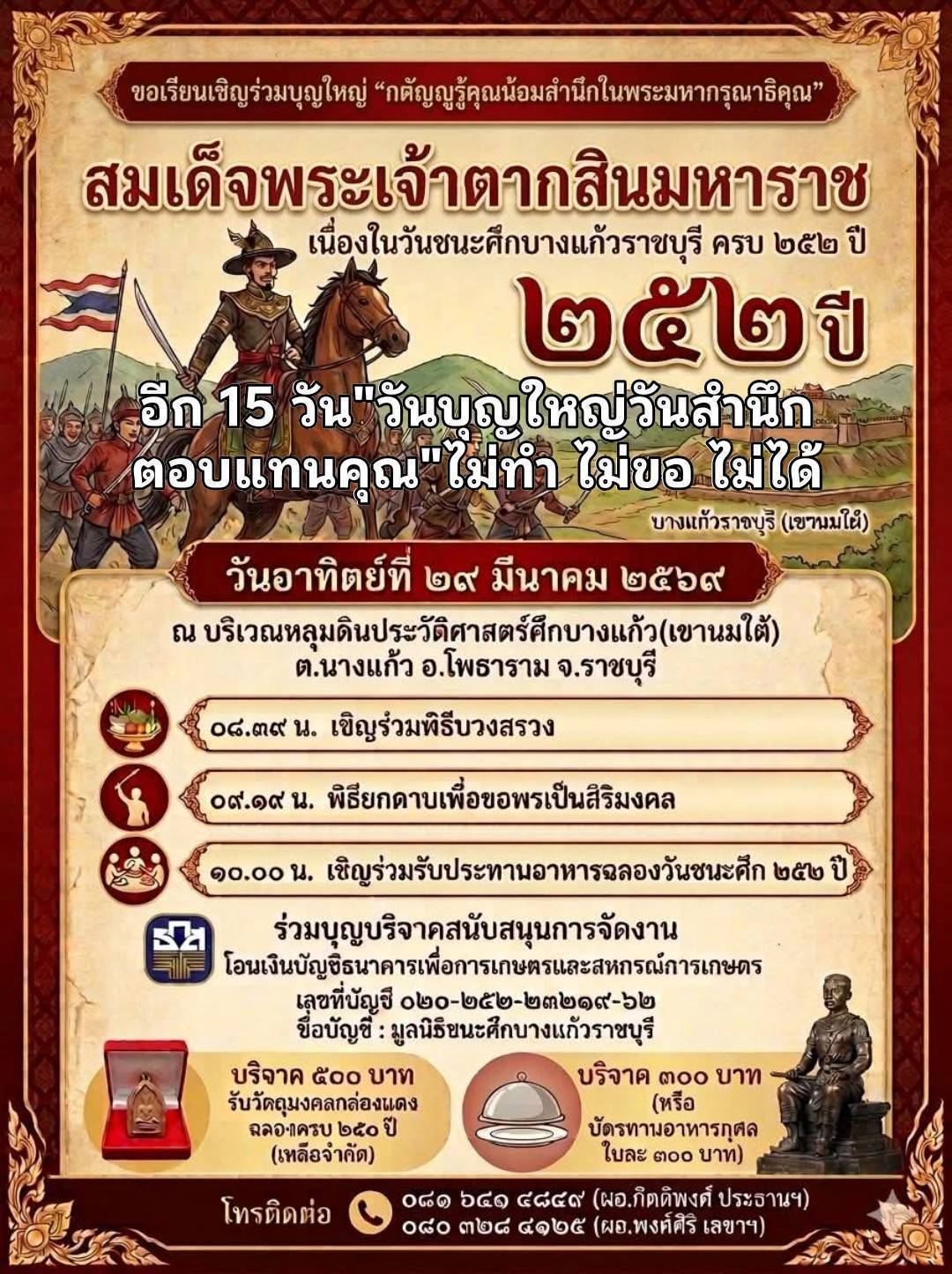 ขอเรียนเชิญร่วมบุญใหญ่“กตัญญูรู้คุณน้อมสำนึกในพระมหากรุณาธิคุณ”สมเด็จพระเจ้าตากสินมหาราชเนื่องในวันชนะศึกบางแก้วราชบุรี ครบ 252 ปี