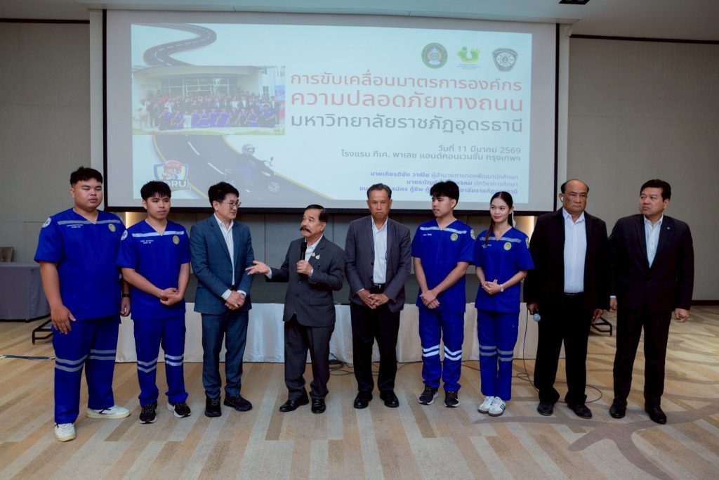 ที่ โรงแรมทีเค พาเลซ แอนด์ คอนเวนชั่น เขตหลักสี่ กรุงเทพมหานคร สำนักงานเครือข่ายลดอุบัติเหตุ (สคอ.) ภายใต้การสนับสนุนของสำนักงานกองทุนสนับสนุนการสร้างเสริมสุขภาพ (สสส.) จัดการประชุม “บูรณาการพลังสื่อ-เอกชน สร้างถนนปลอดภัย” เพื่อผนึกกำลังเครือข่ายจากภาคสื่อมวลชน ภาคเอกชน และสถาบันการศึกษาจากทั่วประเทศ ร่วมขับเคลื่อนการสร้างความปลอดภัยทางถนนอย่างเป็นระบบและยั่งยืน โดยมีผู้แทนจากมหาวิทยาลัยราชภัฏอุดรธานี ได้แก่ นายเกียรติชัย วาณิช ปฏิบัติหน้าที่ในตำแหน่งผู้อำนวยการกองพัฒนานักศึกษา นายธนัญชัย เพ็งพรหม นักวิชาการศึกษา และชมรมอาสาสมัครกู้ชีพกู้ภัย ร่วมเป็นวิทยากรถ่ายทอดประสบการณ์การดำเนินงานด้านความปลอดภัยทางถนนภายในมหาวิทยาลัย