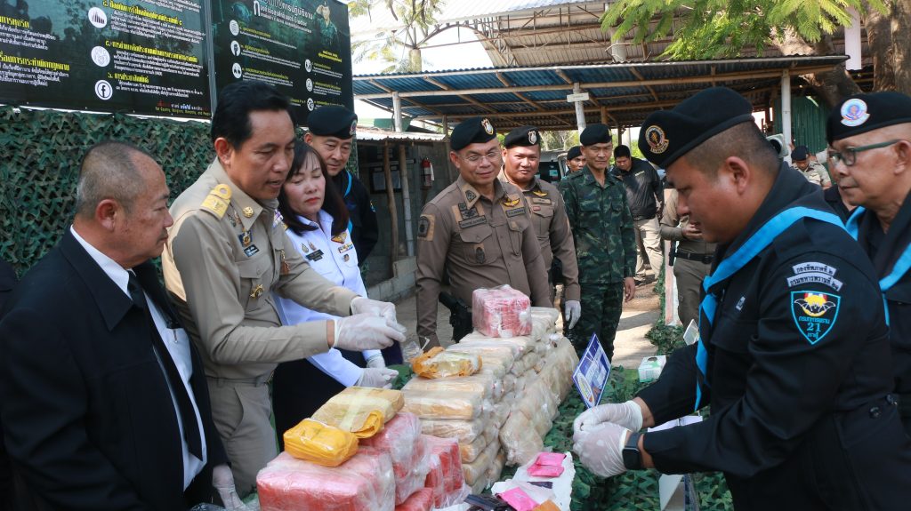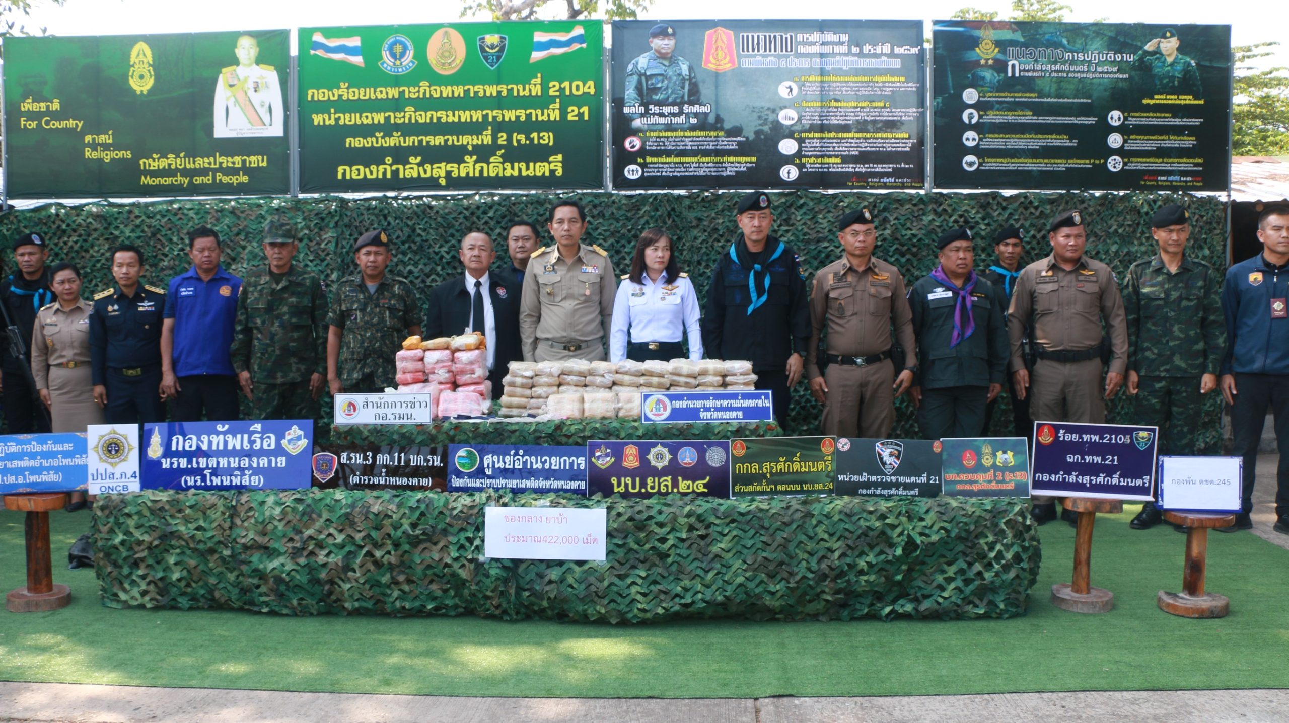 วันที่ 16 มี.ค. 69 ที่ ร้อย.ฉก.ทพ.2104 ฉก.ทพ.21 อ.โพนพิสัย จ.หนองคาย นายไพฑูรย์ มหาชื่นใจ รองผู้ว่าราชการจังหวัดหนองคาย, พ.อ.ศรณณัฐ นวลมณี ผบ.ฉก.ทพ.21, น.ส.วรรณา ผู้อุตส่าห์ นายด่านศุลกากรหนองคาย, นายมนตรี จารุธำรง นายอำเภอโพนพิสัย, พ.ต.อ.วิทยากรณ์ ษมากรวิทิต ผกก.สภ.โพนพิสัย, นายชัยสิทธิ์ คำภาจันทร์ หัวหน้าศูนย์อำนวยการป้องกันและปราบปรามยาเสพติดจังหวัดหนองคาย, พ.ต.วิทยา สิงห์อร ผบ.ร้อย.ฉก.ทพ.2104 ทพ.21 และ ร.ต.ไชโย หรพูน แทน บก.ควบคุมที่ 2 กกล.สุรศักดิ์มนตรี ร่วมกันแถลงผลการตรวจยึดยาบ้า จำนวน 422,000 เม็ด ซึ่งตรวจยึดได้บริเวณริมฝั่งแม่น้ำโขง บ้านถิ่นดุง ซอย 3 หมู่ 10 ต.วัดหลวง อ.โพนพิสัย จ.หนองคาย