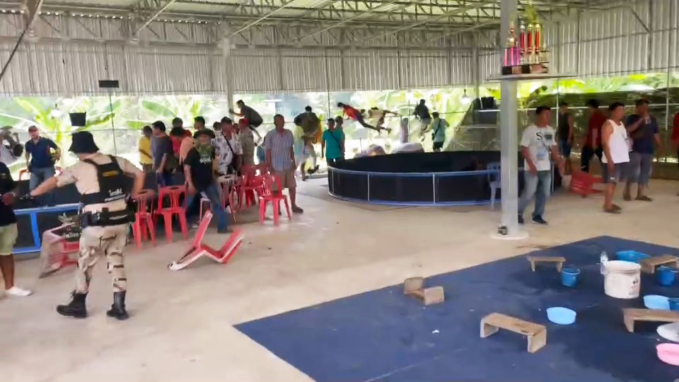 เมื่อไปถึงพบรถยนต์รถจักรยานยนต์จำนวนมากจอดอยู่ เจ้าหน้าที่บุกเข้าจู่โจมแบบสายฟ้าแลบเข้าไปภายในโดมซึ่งมีนักพนักจำนวนมากกำลังส่งเสียงเชียร์ไก่กันอย่างเมามัน เมื่อเห็นเจ้าหน้าที่บุกเข้ามาบรรดานักพนันพากันแตกฮือวิ่งหนีปีรั้วตาข่ายเข้าไปในป่าด้านหลังกันคนละทิศคนละทางสุดท้ายเจ้าหน้าที่สามารถควบคุมตัวนักพนันเอาไว้ได้ จำนวน 60 คนพร้อมของกลางประกอบด้วยสังเวียนชนไก่ จำนวน 1 อันไก่ชน จำนวน 2 ตัว นาฬิกาจับเวลา จำนวน 1 เรือน เงินที่ใช้ในการพนันชนไก่ จำนวน 2,000 บาท สุ่มไก่ จำนวน 2 ใบ สมุดจดคู่ชนไก่ จำนวน 1 เล่ม สมุดจดราคาพนันชนไก่ จำนวน 30 เล่ม
