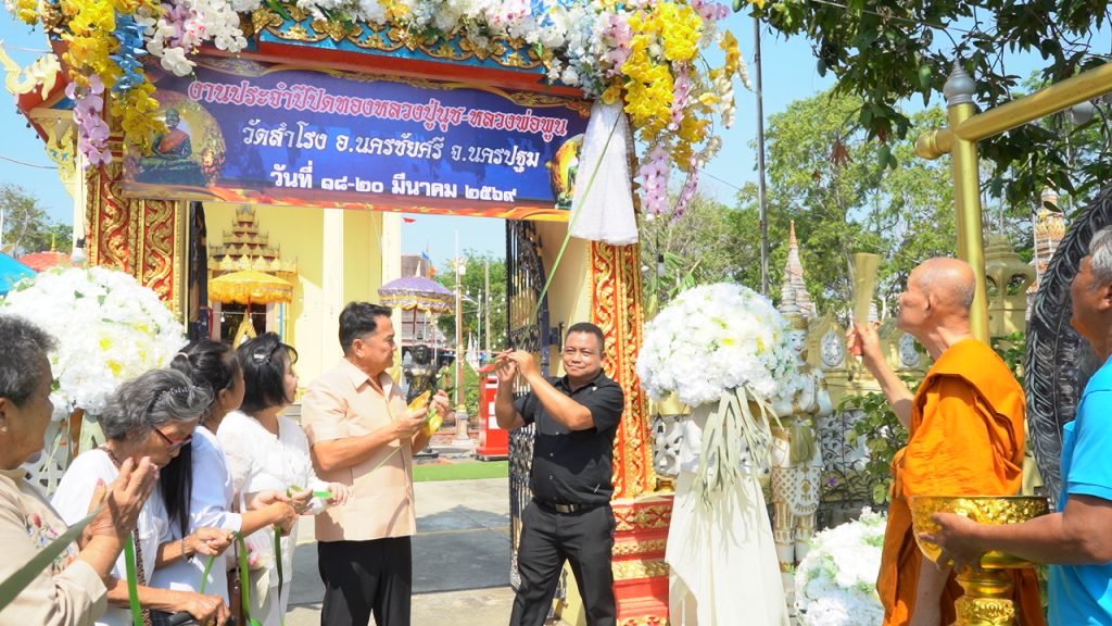 พระครูสิริปุญญาภิวัฒน์ เจ้าคณะอำเภอนครชัยศรี เจ้าอาวาสวัดสำโรง อ.นครชัยศรี จ.นครปฐม จัดพิธีเปิดงานประจำปีปิดทอง หลวงปู่นุช-หลวงพ่อพูน ระหว่างวันที่ 18-20 มี.ค.69 โดยช่วงเข้าวันนี้ได้มีพิธีแห่ พระพุทธปฏิมากรรัตนโกสินทร์ หลวงปู่นุช-หลวงพ่อพูน ทางน้ำ (แม่น้ำท่าจีน) โดยมีชาวบ้านบริเวณใกล้เคียงต่างนำเรือนานาชนิด เข้าร่วมพิธีแห่พระทางน้ำด้วยกว่า 100 ลำ โดยเริ่มแห่จากแพท่าน้ำที่พักสงฆ์พระพุทธเจ้า ต.สัมปทวน อ.นครชัยศรี จ.นครปฐม มายังท่าน้ำวัดสำโรง ระยะทางกว่า 2 กม. จากนั้นเจ้าอาวาสวัดสำโรง นำอดีต ส.ส.นายประถม สูญจันทร์ นายณัทกร ตุ้มทองคำ นายก อบต.สำโรง นายพัสกร ลาภลมูล อดีตกำนันตำบลสำโรง และประชาชนร่วมประกอบพิธีบวงสรวง พร้อมเปิดป้ายงานงานประจำปีปิดทอง หลวงปู่นุช-หลวงพ่อพูน ภายในงานมีการออกร้านค้ามากมาย พร้อมมหรสพ เช่น รำวงย้อนยุค ตะกร้อรอดห่วง การแข่งขันเรือเร็ว เช่น เรือปลาท้องตอน 10 ศอก เรือปลาท้องตอนสแตนดาร์ด (ชาวบ้าน) ยาว 3 วา 1 ศอก ฯลฯ ชิงเงินรางวัล 5,000-3,000 และ 2,000 บาท