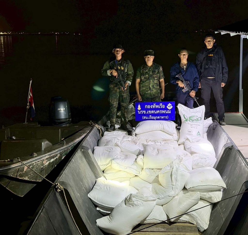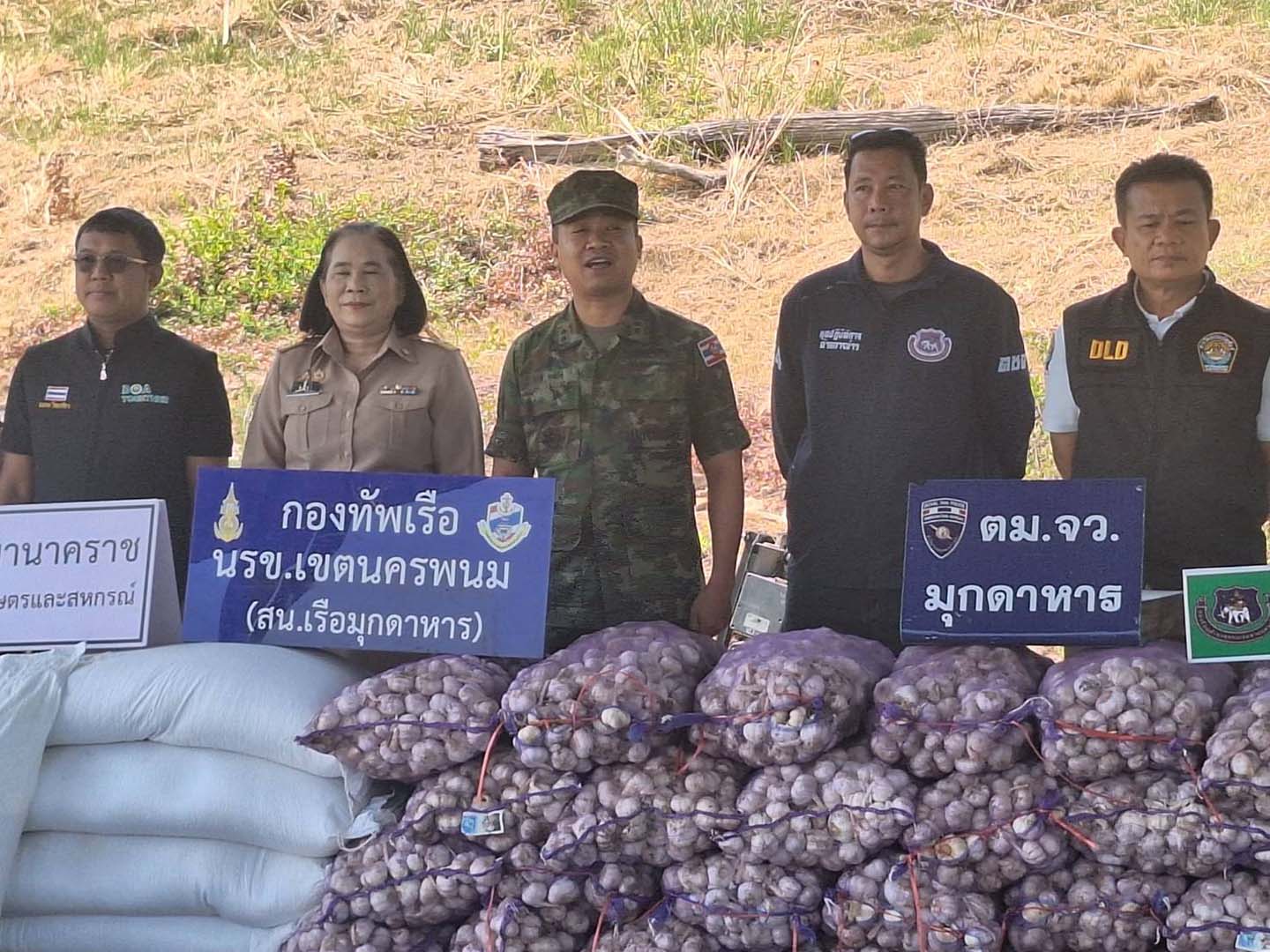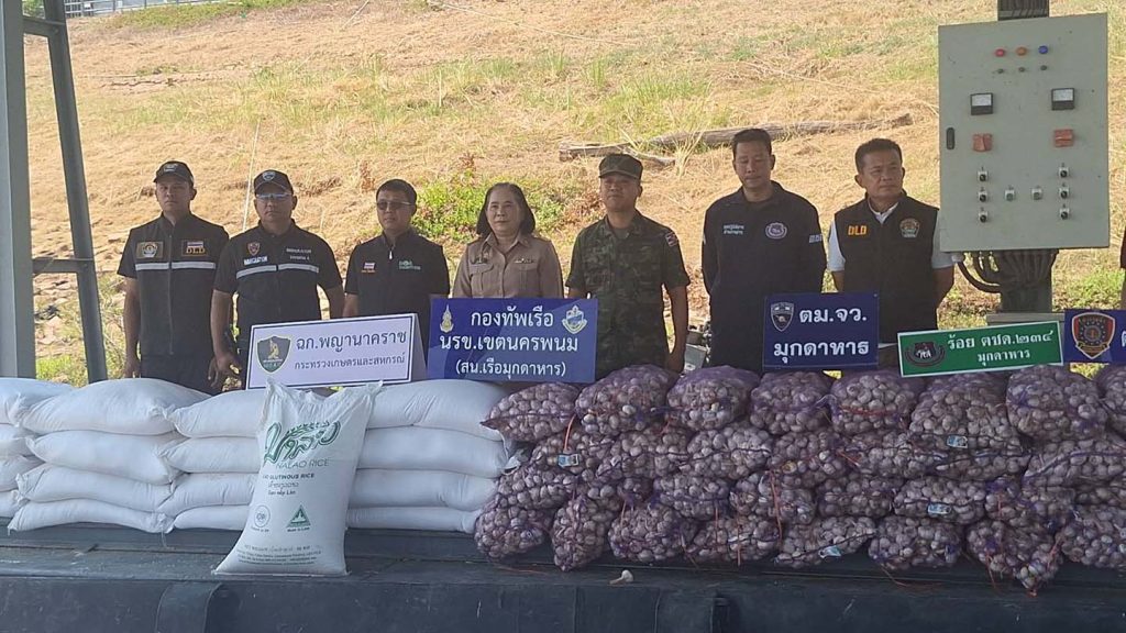 มุกดาหาร นรข สนธิกำลังตรวจยึดข้าวสาร 150 กส พร้อมกระเทียมแห้ง 72 กระสอบ