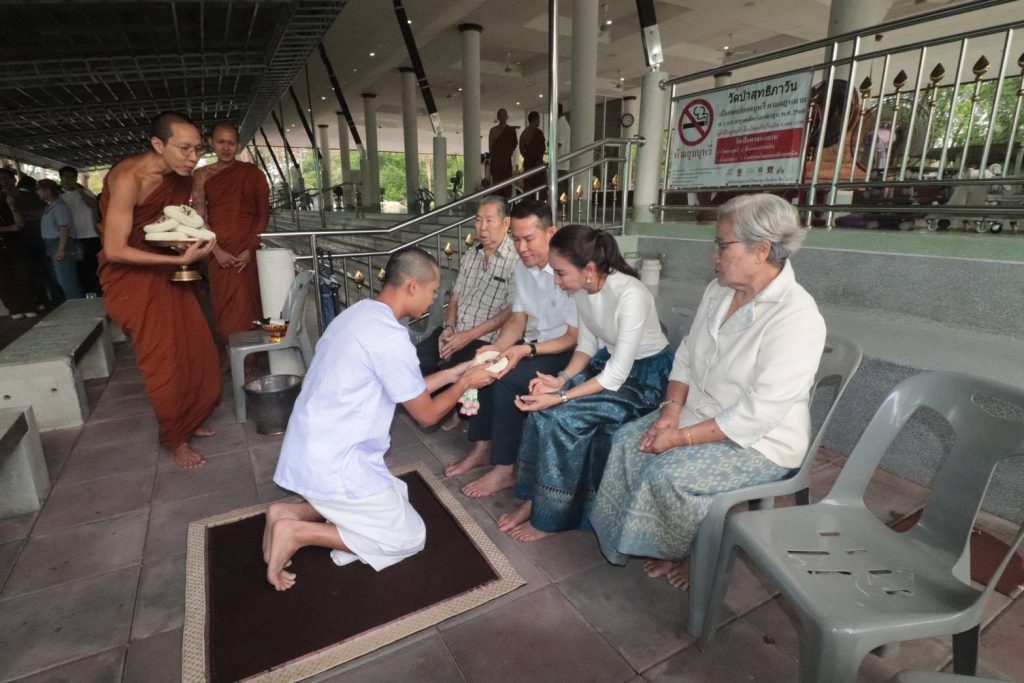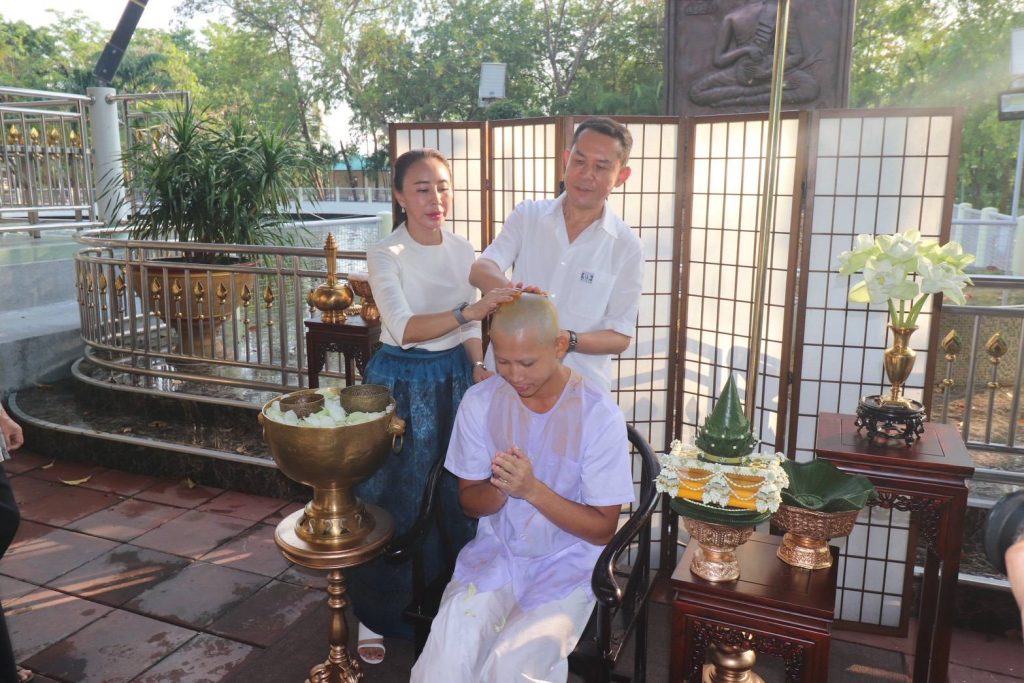 เวลา 16.00 น. วันที่ 18 มีนาคม 2569 ที่วัดป่าสุทธิภาวัน พัทยา จ.ชลบุรี ครอบครัวธีระพรสถานนท์ โดย นายศักดิ์สิทธิ์ ธีระพรสถานนท์ หรือ เสี่ยสม (บิดา) นางศิดารัศ รักธรรมสงบ (มารดา) ผู้บริหารโครงการเอสพีกรุ๊ป พัทยา ให้การต้อนรับกลุ่มสาธุชนจำนวนมากที่ทยอยร่วมพิธีปลงผมนาคปริ้นซ์-ณัฐภัควัฒน์ ธีระพรสถานนนท์ (บุตร) ในโอกาสอุปสมบทเข้าร่มกาสาวพัสตร์ตอบแทนพระคุณบิดา-มารดา