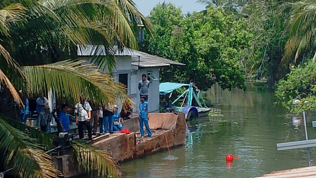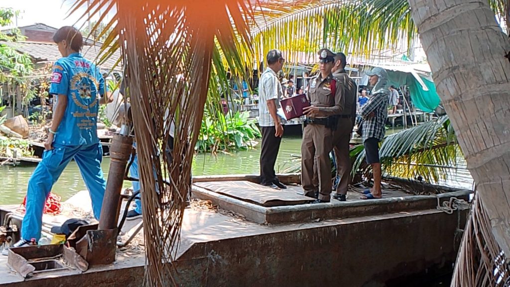 ที่เกิดเหตุเป็นคลองกว้างประมาณ15 เมตรลึกประมาณ 5-6 เมตร พบชาวบ้านกำลังยืนมุงดูเหตุการณ์ ภายในคลองพบเรือเครื่อง เรืออีป๊าบ 1 ลำมีรอยเฉี่ยวชน ลอยอยู่ริมตลิ่ง และมีเรือหาปลาและเรือชาวบ้านช่วยกันค้นหาทราบว่า มีผู้สูญหายภายในน้ำ 1 ราย ทราบชื่อ นายเด่น หรือ ช่างเด่น ตะโกจีน อายุ 44 ปี เจ้าหน้าที่กูภัยจึงจัดทีมประดาน้ำลงค้นหาผู้สูญหาย ใช้เวลาประมาณ 2 ชั่วโมง จึงพบศพ ชันสูตรเบื้องต้นพบว่ามีบาดแผลถูกกระแทะที่ลำตัวด้านหน้า จึงมอบศพให้มูลนิธิกู้ภัยพรานพิทักษ์ ส่งชันสูตรที่ร.พ.สามพราน
