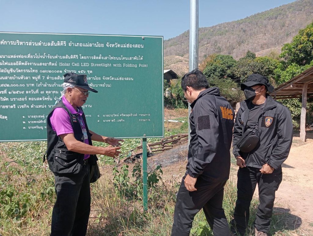 ปปช.แม่ฮ่องสอนลงพื้นที่ตรวจสอบโครงการพัฒนาแหล่งท่องเที่ยวโป่งน้ำร้อน บ้านหัวลา ตำบลสันติคีรี อ.แม่ลาน้อย พบเสาไฟแอลอีดีพลังงานแสงอาทิตย์ไปไม่ถึงโป่งน้ำตามตามที่เขียนโครงการเพื่อขอรับสนับสนุนระบบไฟฟ้าพลังงานแสงอาทิตย์