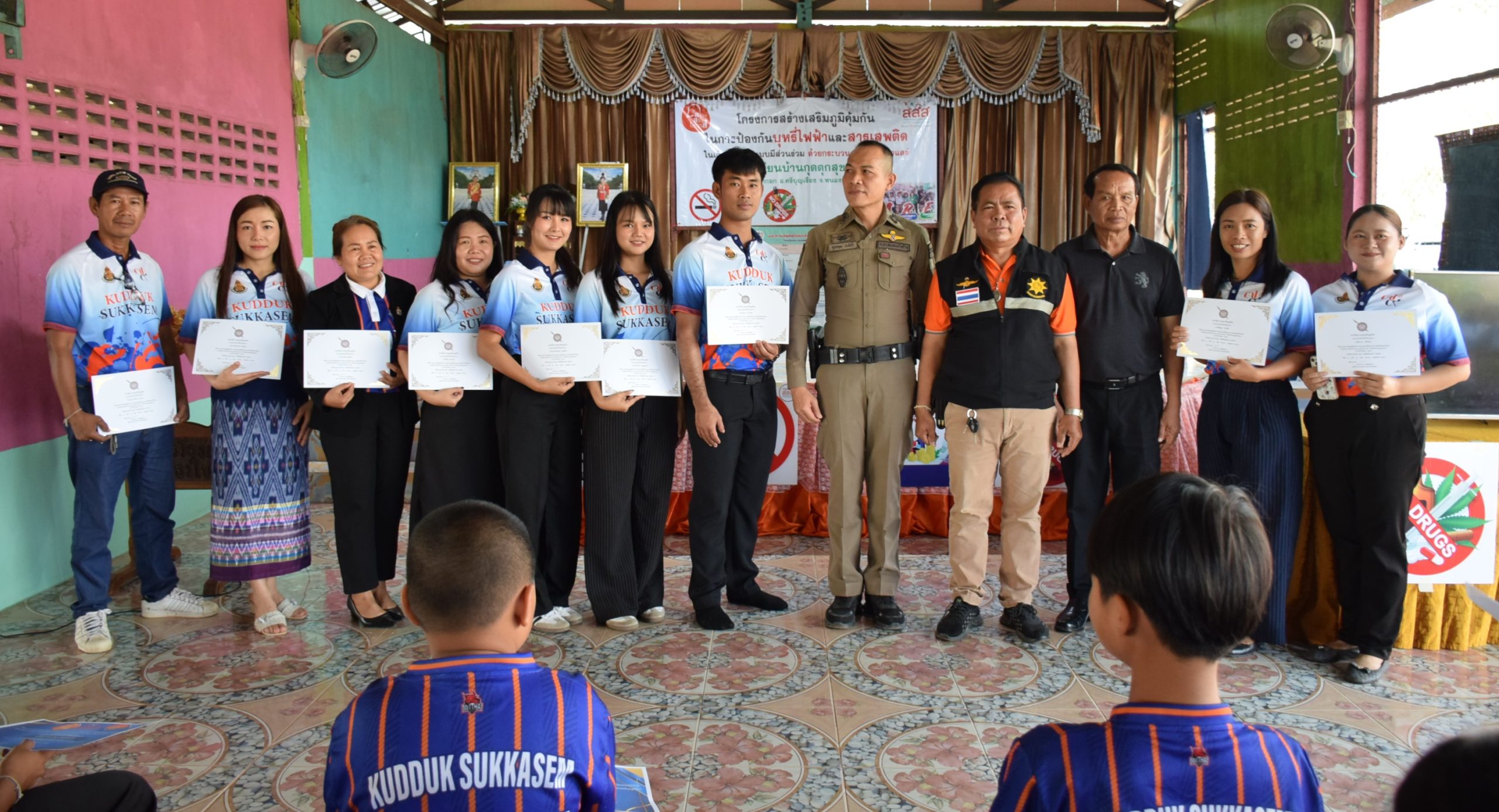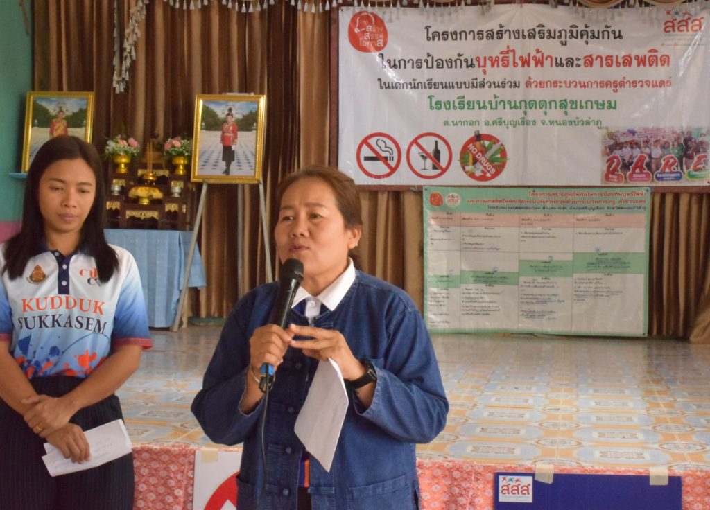 แล้วก็พาลูกฝึกในเรื่องของฝึกจิตขั้นสูงกว่าก็คือให้มีสติ มีสมาธิในการใช้ชีวิตประจำวันซึ่งก็ฝึกไม่ยากเลยแค่รู้ลมหายใจเข้าออกการที่มีสภาวะจิตที่สูงกว่านี้ เป็นตัวสำคัญที่จะให้ลูกเกิดความสงบเกิดความสุขโดยไม่ต้องไปพึ่งยาเสพติดแล้วก็เกิดปัญญา และสามารถที่จะแยกแยะผิดชอบชั่วดีออก อันนี้คือขั้นสูงเลย ขั้นสูงสุดของการพัฒนาลูกหลานเลย แต่ถ้าเรายังไม่ได้ฝึกสิ่งเหล่านี้ลูกก็ยังจะใช้ชีวิตแบบทั่วไปในชุมชนแล้วไม่ว่าจะเป็นเรื่องของสิ่งเสพติด เรื่องของสิ่งที่เข้ามาเยอะๆลูกก็จะแยกแยะไม่ออก แล้วก็เอาตัวเองไม่รอด เพราะฉะนั้นหัวใจสำคัญคือพ่อแม่เป็นตันแบบ เป็นหัวใจที่จะให้ความรักความอบอุ่นไม่ให้เขาไปพึ่งยาเสพติด เพราะฉะนั้นคุณพ่อคุณแม่ก็คือหัวใจสำคัญ ผู้นำชุมชนโดยเฉพาะผู้ใหญ่บ้านผู้นำทุกท่านเลยแล้วก็มีคุณครูที่เป็นปูชนียะบุคคลที่สำคัญที่เป็นต้นแบบแล้วก็คอยประคับประคองคอยเอ่อแก้ไขได้ไม่ยากเลยค่ะ ดร.กัลฐิพร (อุ๊) หัวหน้ากลุ่มงานการพยาบาลจิตเวช โรงพยาบาลหนองบัวลำภู กล่าวทิ้งท้าย