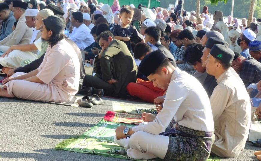 วันนี้ (21 มี.ค. 2569) ที่ลานเขื่อนท่าพระยาสาย เขตเทศบาลเมืองนราธิวาส อำเภอเมืองนราธิวาส จังหวัดนราธิวาส ชาวไทยมุสลิมกว่า 2,000 คน ร่วมประกอบศาสนกิจละหมาดเนื่องในวันอีฎิ้ลฟิตรี ฮิจเราะห์ศักราช 1447 ท่ามกลางบรรยากาศอบอุ่น โดยประชาชนส่วนใหญ่เดินทางมาเป็นครอบครัว พร้อมแต่งกายชุดมลายูใหม่อย่างสวยงาม