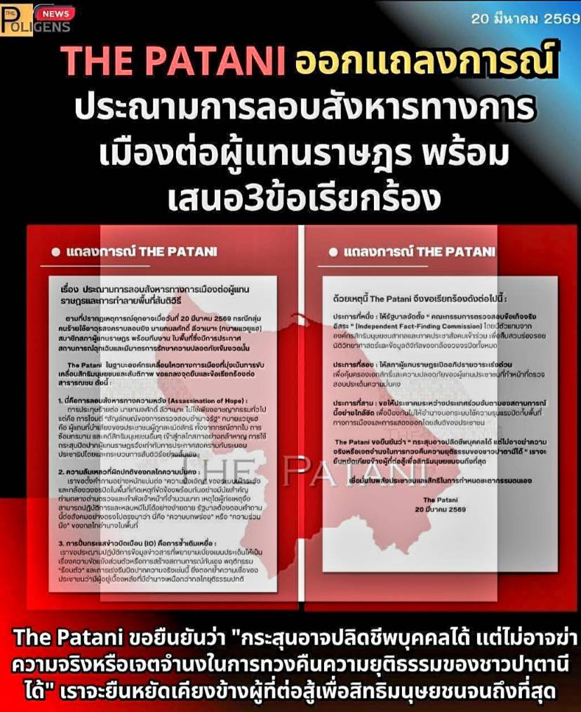 ล่าสุด THE PATANI ออกแถลงการณ์ ประณามการลอบสังหารทางการเมืองต่อผู้แทนราษฎร พร้อมเสนอ 3 ข้อเรียกร้อง ขอยืนยันว่า “กระสุนอาจปลิดชีพบุคคลได้ แต่ไม่อาจฆ่าความจริงหรือเจตจำนงในการทวงคืนความยุติธรรมของชาวปาตานีได้” เราจะยืนหยัดเคียงข้างผู้ที่ต่อสู้เพื่อสิทธิมนุษยชนจนถึงที่สุด