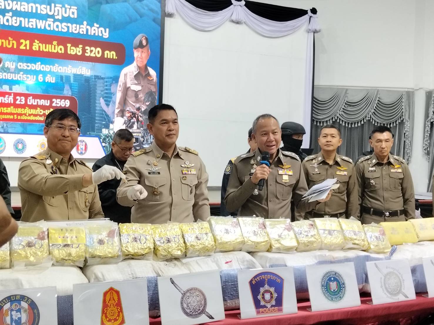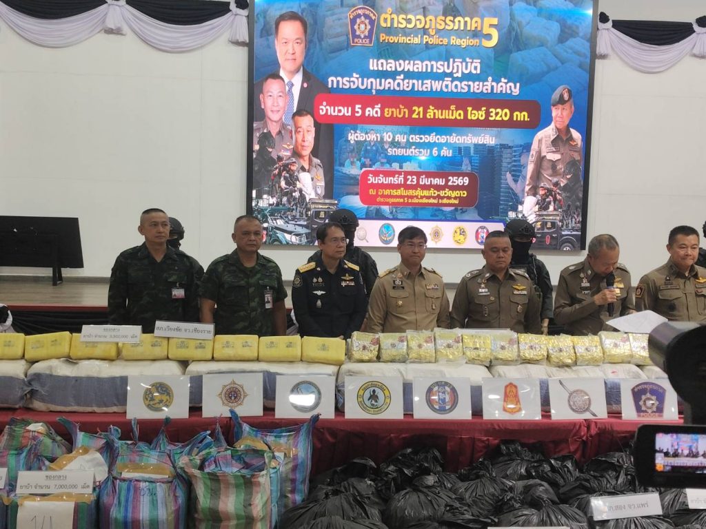เมื่อวันที่ 23 มีนาคม 2569 เวลา 11.00 น. ที่ห้องประชุมอาคารสโมสรคุ้มแก้วขวัญดาว สำนักงานตำรวจภูธรภาค 5 อำเภอเมืองเชียงใหม่ จังหวัดเชียงใหม่ พล.ต.ท.กฤตธาพล ยี่สาคร ผบช.ภ.5 พร้อมหน่วยงานที่เกี่ยวข้อง ทหาร ตำรวจ ปกครอง ร่วมการแถลงข่าว จับผู้กระทำผิดในคดียาเสพติดรายสำคัญจำนวน 5 คดี รวมของกลางยาบ้า 21 ล้านเม็ด , ไอซ์ 320 กก. ผู้ต้องหา 10 คน , รถยนต์ 6 คัน
