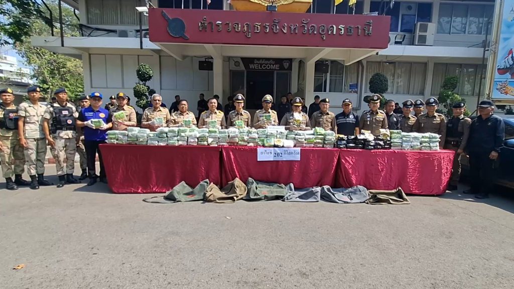 เมื่อเวลา 10.10 น.วันที่ 23 มีนาคม 2569 ที่หน้ากองบังคับการตำรวจภูธรจังหวัดอุดรธานี นายราชันย์ ซุ้นหั้ว ผวจ.อุดรธานี พล.ต.ต.ธวัชชัย ถุงเป้า ผบก.ภ.จ.อุดรธานี พ.ต.อ.อนุศักดิ์ ศักดาวัชรานนท์ รอง ผบก.ภ.จ.อุดรธานี พ.ต.อ.พัฒนวงศ์ จันทร์พล ผกก.สภ.เมืองอุดรธานี นายชวิศ ป้องขันธ์ นายอำเภอเมืองอุดรธานี นายกิตติกร ทีฆธนานนท์ นายกเทศมนตรีเทศบาลนครอุดรธานี ร่วมกันแถลงข่าวการจับนายประชา แพงแสน หรือบุ๊ค อายุ 19 ปี อยู่บ้านเลขที่ 269 หมู่ 5 ต.โนนสูง อ.เมือง จ.อุดรธานี ในข้อกล่าวหา “ร่วมกันจำหน่ายยาเสพติดให้โทษประเภท 1 (ยาไอซ์ หรือเมทแอมเฟตามีน) โดยการมีไว้เพื่อจำหน่าย อันเป็นการกระทำเพื่อการค้า เพื่อก่อให้เกิดการแพร่กระจายในกลุ่มประชาชน โดยไม่ได้รับอนุญาต ซึ่งทำให้เกิดผลกระทบต่อความมั่นคงของรัฐ หรือความปลอดภัยของประชาชนทั่วไป และเสพยาเสพติดให้โทษประเภท 1 (เมทแอมเฟตามีน) โดยฝ่าฝืนกฎหมาย” พร้อมของกลาง ยาไอซ์ 202 กิโลกรัม รถเก๋งมาสด้า 2 สีดำ ทะเบียน ขข 7333 อุดรธานี โดยจับกุมได้เวลา 02.05 น. วันที่ 21 มีนาคม 2569 ที่ถนนศุภกิจจรรยา หน้าสำนักงานเกษตรจังหวัดอุดรธานี เขตเทศบาลนครอุดรธานี ซึ่งมีคลิปสายตรวจประชาชน เขตงานนาคา เข้าตรวจค้นรถพร้อมกับควบคุมตัวผู้ต้องหา