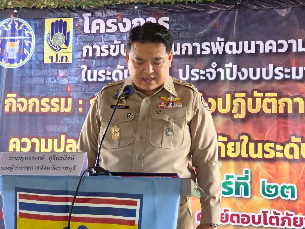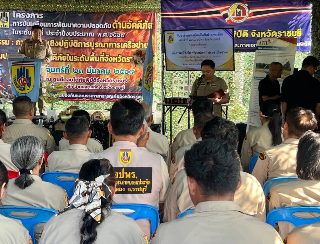 วันที่ 23 มีนาคม พ.ศ. 2569 ณ ศูนย์ตอบโต้ภัยพิบัติจังหวัดราชบุรี ต.ยางหัก อ.ปากท่อ จ.ราชบุรี นายพุทธพงษ์ สุริยะสิงห์ รองผู้ว่าราชการจังหวัดราชบุรี เป็นประธานในพิธีเปิดกิจกรรมเนื่องใน “วันอาสาสมัครป้องกันภัยฝ่ายพลเรือน (อปพร.) ประจำปี 2569” เพื่อรำลึกถึงความสำคัญและเชิดชูเกียรติสมาชิก อปพร. ผู้เป็นกำลังสำคัญในการบำบัดทุกข์บำรุงสุขแก่พี่น้องประชาชน ภายในงานมี นายณัฐวุฒิ เบ็ญจสุรัตน์วงศ์ หัวหน้ากลุ่มงานยุทธศาสตร์และการจัดการ รักษาราชการแทนหัวหน้าสำนักงานป้องกันและบรรเทาสาธารณภัยจังหวัดราชบุรี กล่าวรายงาน พร้อมด้วยหัวหน้าส่วนราชการ นายอำเภอปากท่อ นายกองค์การบริหารส่วนตำบลยางหัก ผู้นำท้องถิ่น และสมาชิก อปพร. เข้าร่วมกิจกรรมอย่างพร้อมเพรียง