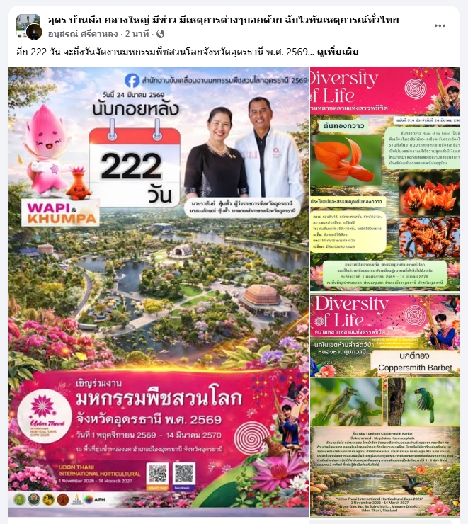 เมื่อเวลา 13.30 น.วันที่ 24 มีนาคม 2569 ที่สำนักงานใหญ่ กรมทางหลวง เลขที่ 2/486 ถนนศรีอยุธยา แขวงทุ่งพญาไท เขตราชเทวี กรุงเทพมหานคร นายราชันย์ ซุ้นหั้ว ผู้ว่าราชการจังหวัดอุดรธานี พร้อมด้วย นายณฐพล วิถี รองผู้ว่าราชการจังหวัดอุดรธานี ได้นำ ร้อยโทรัฐพงษ์ กาจกำแหง หัวหน้าเจ้าหน้าที่่สำนักงานขับเคลื่อนงานมหกรรมพืชสวนโลกอุดรธานี 2569 และเจ้าหน้าที่ที่เกี่ยวข้องในงานกิจกรรมพืชสวนโลกในครั้งนี้เดินทางเข้าพบนายปิยพงษ์ จิวัฒนกุลไพศาล อธิบดีกรมทางหลวง
