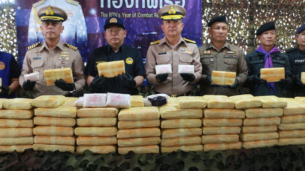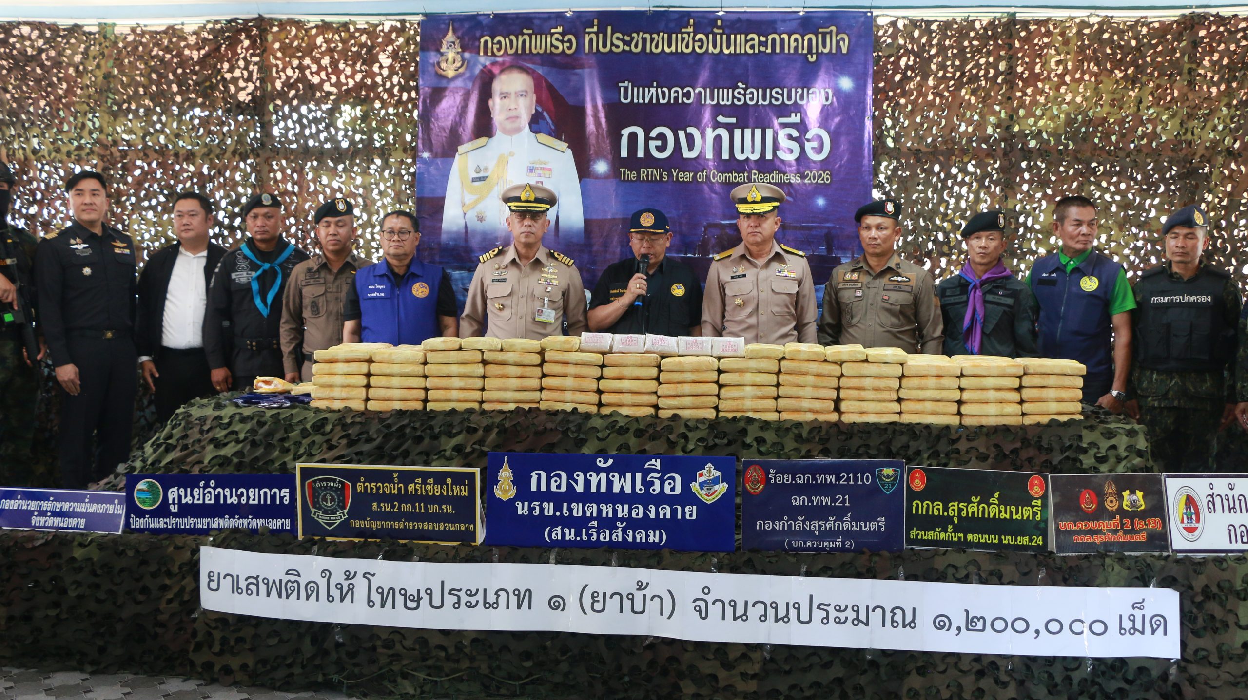 ผบ.นรข.,นายกิตติศักดิ์ ธีระวัฒนา รอง ผวจ.หนองคาย,น.อ.วิศิษฐ์พงศ์ เจริญวิชยเดช ผบ.นรข.เขตหนองคาย,พ.ต.อ. อดุลย์ ศรีทอง ผกก.สภ.สังคม,นายนวน โทบุตร นอภ.สังคม,นายชัยสิทธิ์ คำภาจันทร์ หน.ศอ.ปส.จ.นค.,ร.อ.ไพสน พลเสน หน.เรือสังคม นรข.เขตหนองคาย,ร.อ.ยุทธณา สีไชย์ ผบ.ร้อย ฉก.ทพ.2110 ฉก.ทพ.21 บก.ควบคุมที่ 2 กกล.สุรศักดิ์มนตรี,นายพัฒนพงศ์ ตันติวัฒนกุลชัย หน.ฝ่ายศุลกากรที่ 1,ตชด.246,และหน่วยงานความมั่นคงในพื้นที่ ร่วมกันแถลงผลการผลการตรวจยึดยาบ้า 1.2 ล้านเม็ด หลังจากที่กลุ่มขบวนการค้ายาเสพติดข้ามชาติ ลักลอบนำเข้ามาจากประเทศเพื่อนบ้าน วางไว้ที่บริเวณริมฝั่งแม่น้ำโขง บ้านผาแดง หมู่ที่ 3 ต.สังคม อ.สังคม จ.หนองคาย เพื่อรอการลำเลียง แต่ถูก จนท.สน.เรือสังคม ร่วมกับ ฉก.ทพ.2110 ตรวจพบได้เสียก่อน