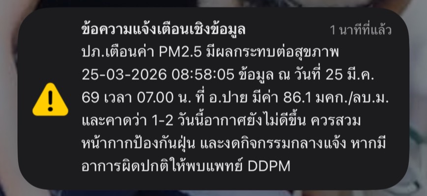 เมื่อวันที่ 25 มีนาคม 2569 ศูนย์ปฏิบัติการป้องกันและแก้ไขปัญหาไฟป่า ได้สรุปสถานการณ์ไฟป่า หมอกควันและฝุ่นละออง ในพื้นที่จังหวัดแม่ฮ่องสอน ประจำวันที่ 25 มีนาคม 2569 จุดความร้อน (Hotspot) ดาวเทียม Suomi NPP ระบบ VIIRS ประจำวันที่ 25 มีนาคม 2569 รอบเช้า เวลา 01.54 น. พบจุดความร้อน 77 จุด 1.จุดความร้อนประจำวันที่ 24 มีนาคม 2569 (เมื่อวานนี้) จำนวน 154 จุด 2.จุดความร้อนสะสมตั้งแต่วันที่ 1 มกราคม – 24 มีนาคม 2569 จำนวน 700 จุด สูงสุดที่อำเภอแม่สะเรียง จำนวน 222 จุด โดยเกิดขึ้นสูงสุดในพื้นที่ป่าอนุรักษ์ จำนวน 367 จุด 3.คุณภาพอากาศประจำวันที่ 25 มีนาคม 2569 (เฉลี่ย 24 ชั่วโมง ณ เวลา 07.00 น.) 3.1 ค่า PM2.5 สถานีอำเภอเมืองแม่ฮ่องสอน เท่ากับ 30.8 ไมโครกรัมต่อลูกบาศก์เมตร (ค่ามาตรฐานเกิน 37.5 ไมโครกรัมต่อลูกบาศก์เมตร คุณภาพอากาศโดยรวมอยู่ในระดับปานกลาง) 3.2 ค่า PM2.5 สถานีอำเภอแม่สะเรียง เท่ากับ 53.1 ไมโครกรัมต่อลูกบาศก์เมตร (ค่ามาตรฐานเกิน 37.5 ไมโครกรัมต่อลูกบาศก์เมตร คุณภาพอากาศโดยรวมอยู่ในระดับเริ่มมีผลต่อสุขภาพ) 3.3 ค่า PM2.5 สถานีอำเภอปาย เท่ากับ 86.1 ไมโครกรัมต่อลูกบาศก์เมตร (ค่ามาตรฐานเกิน 37.5 ไมโครกรัมต่อลูกบาศก์เมตร คุณภาพอากาศโดยรวมอยู่ในระดับมีผลกระทบต่อสุขภาพ)