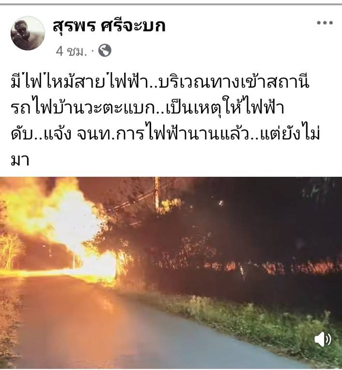 ผู้ใช้เฟสบุ๊คชื่อสมพร ศรีจะบกได้โพสคลิปไฟไหม้และข้อความลงในโซเชียล โดยระบุว่า มีไฟไหม้สายไฟฟ้า..บริเวณทางเข้าสถานีรถไฟบ้านวะตะแบก..เป็นเหตุให้ไฟฟ้าดับ..แจ้ง จนท.การไฟฟ้านานแล้ว..แต่ยังไม่มา