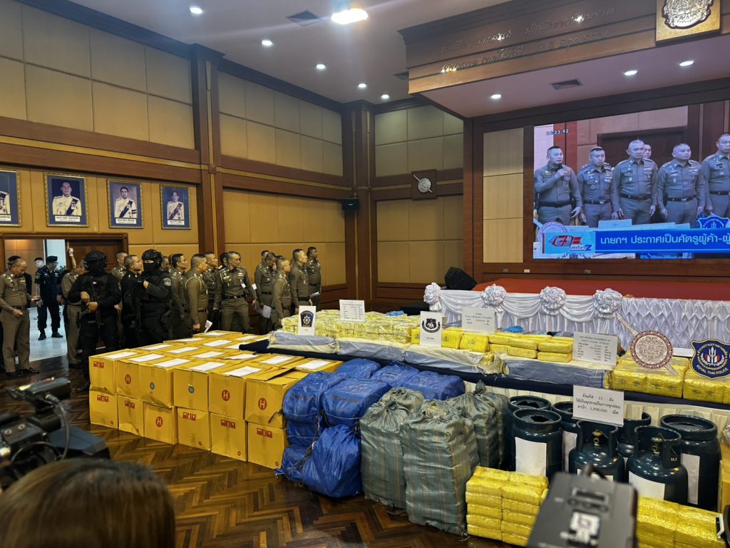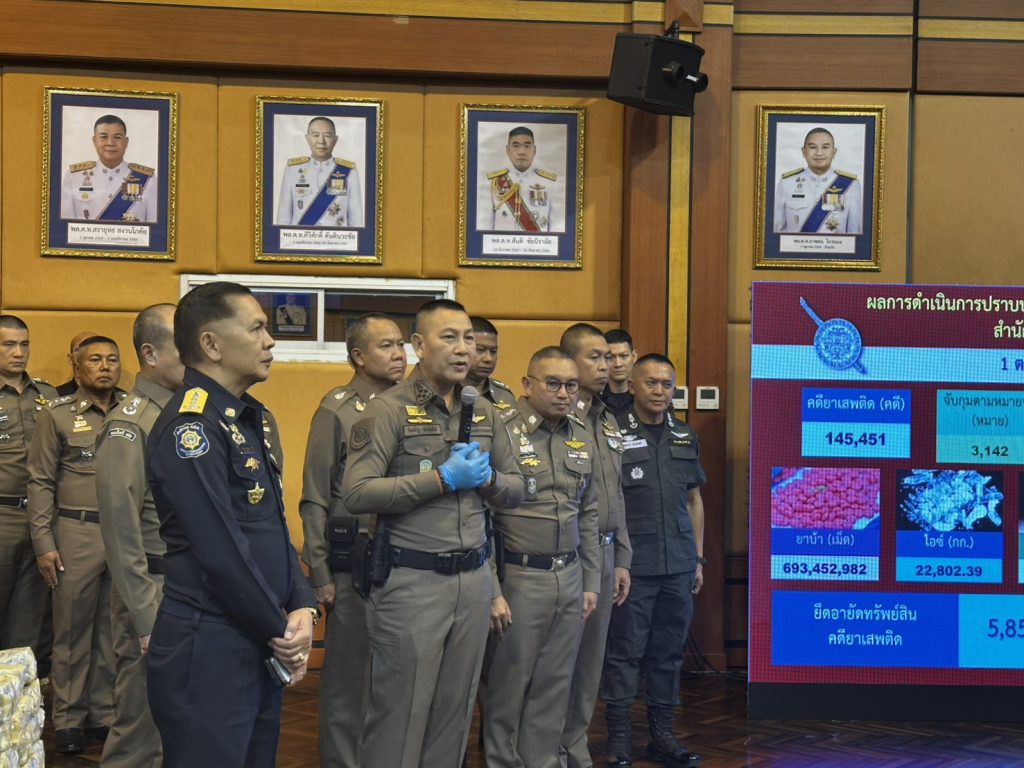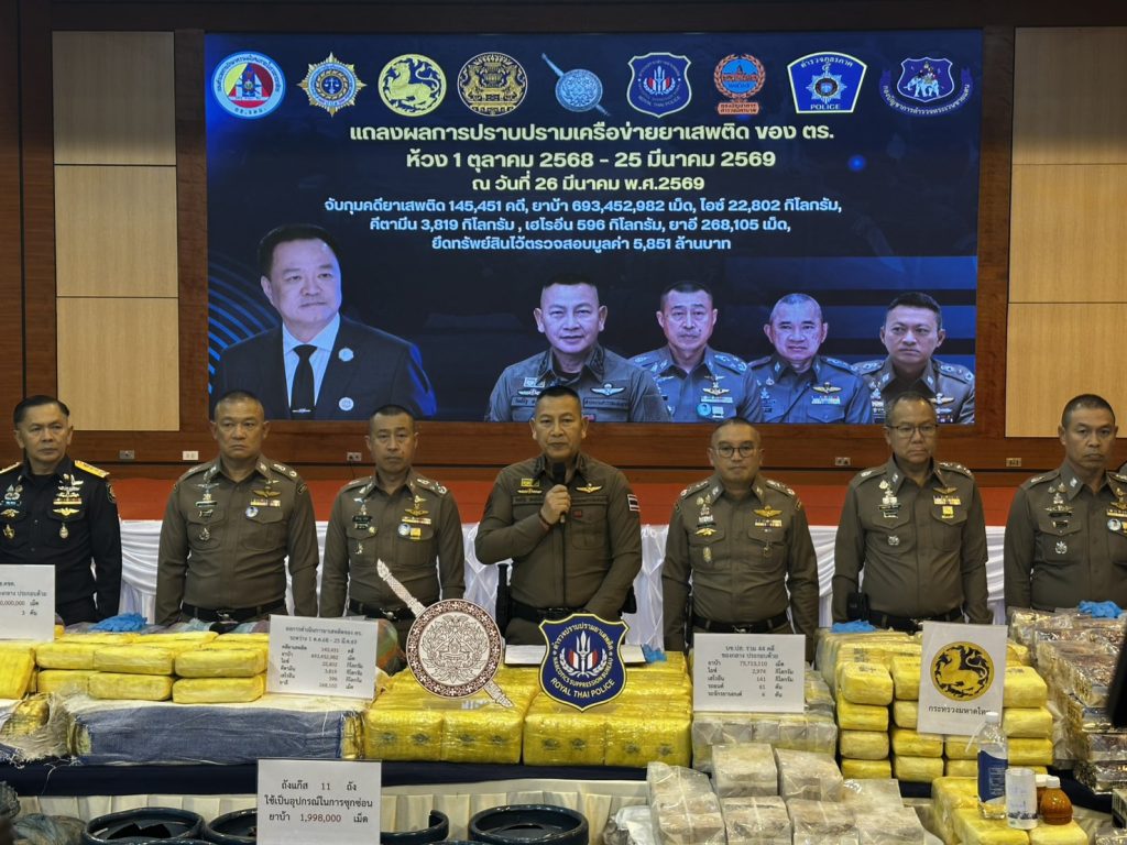 พล.ต.อ.กิตติ์รัฐ พันธุ์เพ็ชร์ ผบ.ตร เป็นประธานการแถลงผลการปฏิบัติงานด้านการปราบปรามยาเสพติด ของสำนักงานตำรวจแห่งชาติ ในห้วง 6 เดือนแรกของ ปีงบประมาณ 2569 โดยมี พล.ต.อ.สำราญ นวลมา รอง ผบ.ตร., พล.ต.ท.อาชน ไกรทอง ผบช.ปส., พล.ต.ท.สยาม บุญสม ผบช.น. และตำรวจภูธรภาค 5 โดย พล.ต.ท.กฤตธาพล ยี่สาคร ผบช.ภ.5, พล.ต.ต.ธนะรัชต์ ชุ่มสวัสดิ์ รอง ผบช.ภ.5, รอง ผบก.ภ.จว.ในสังกัด ภ.5 เข้าร่วมการแถลง ณ กองบัญชาการตำรวจปราบปรามยาเสพติด กทม.
