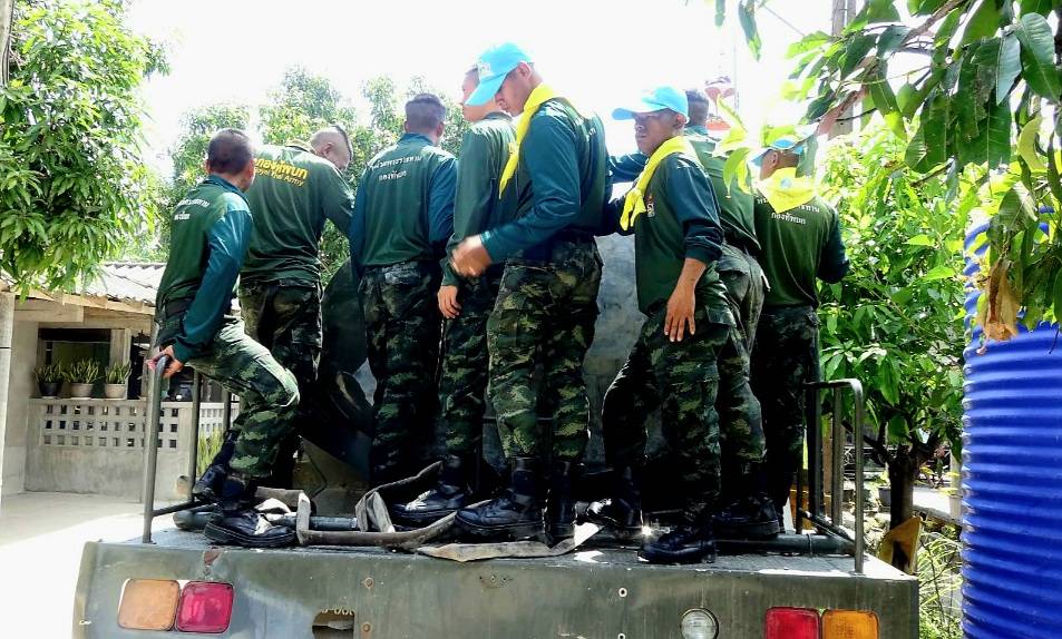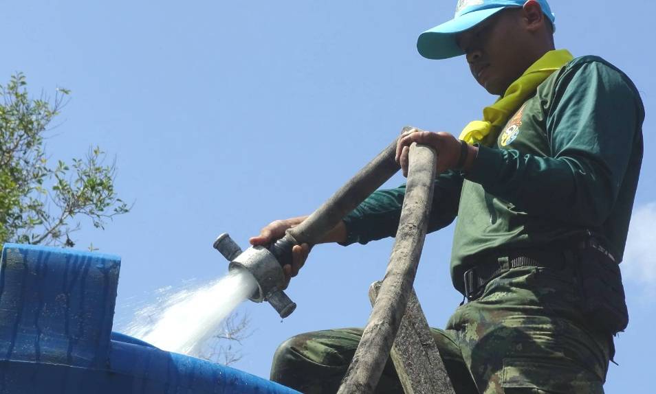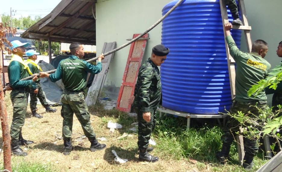 โดยรถน้ำของหน่วยฯ จำนวน 2 คัน บรรจุน้ำคันละ 6,000 ลิตร รวม 12,000 ลิตร ตระเวนใส่ตามถังน้ำขนาดใหญ่ของแต่ละครัวเรือน และถังใส่น้ำเท่าที่ชาวบ้านมี ได้กักเก็บไว้ใช้