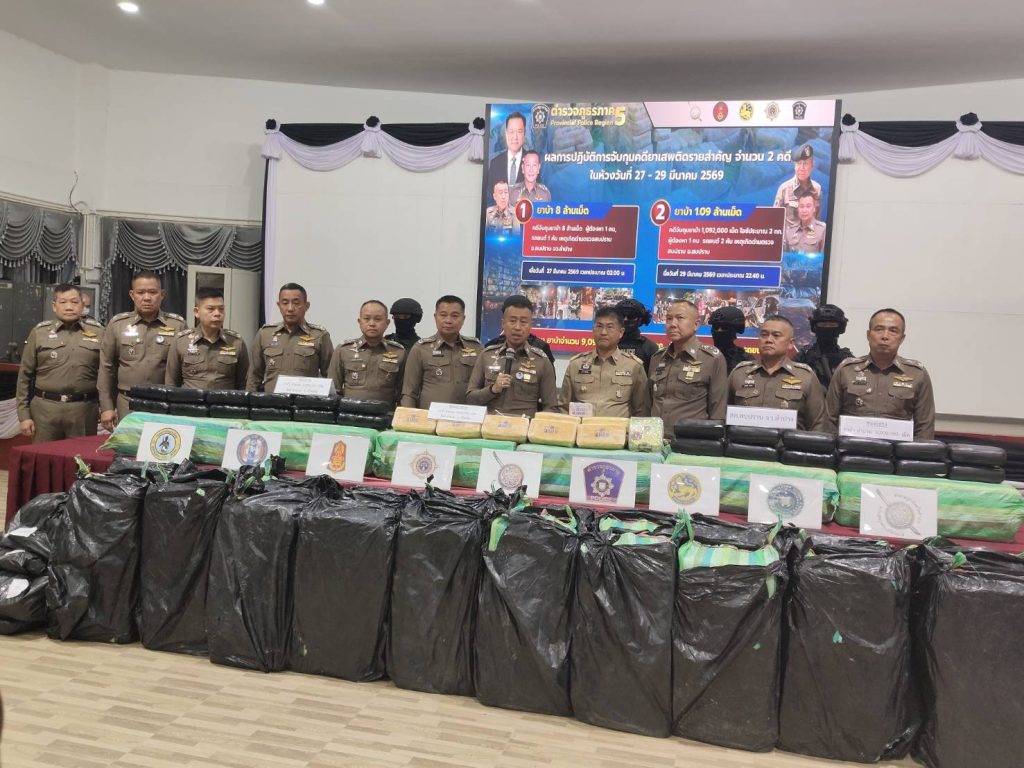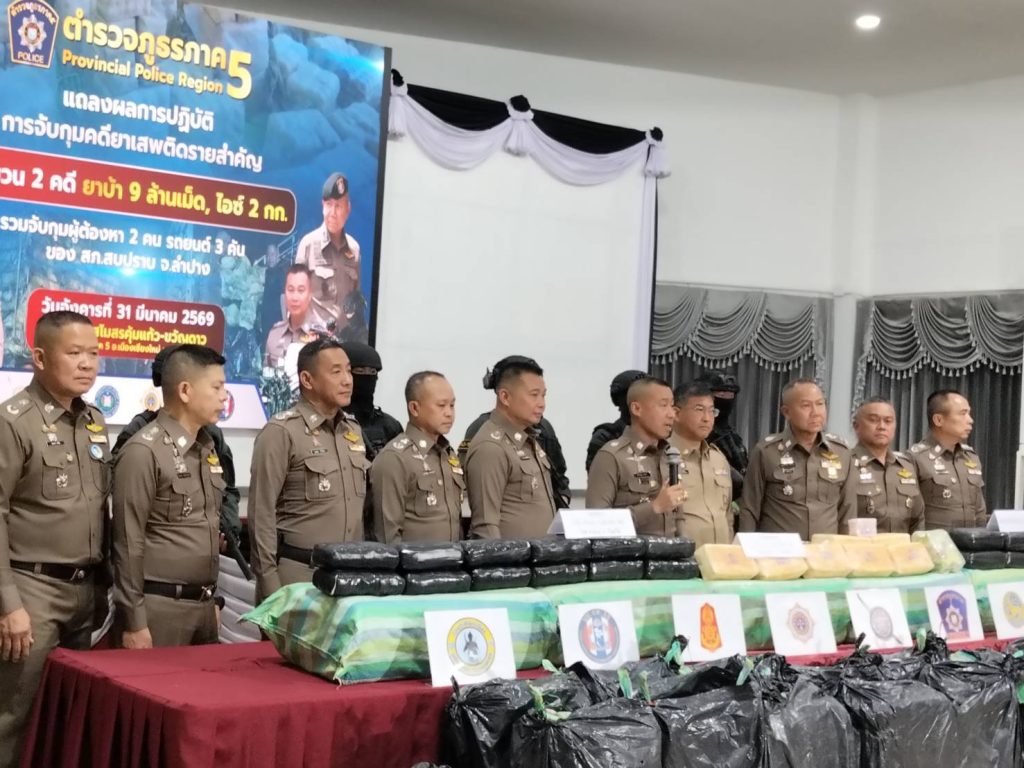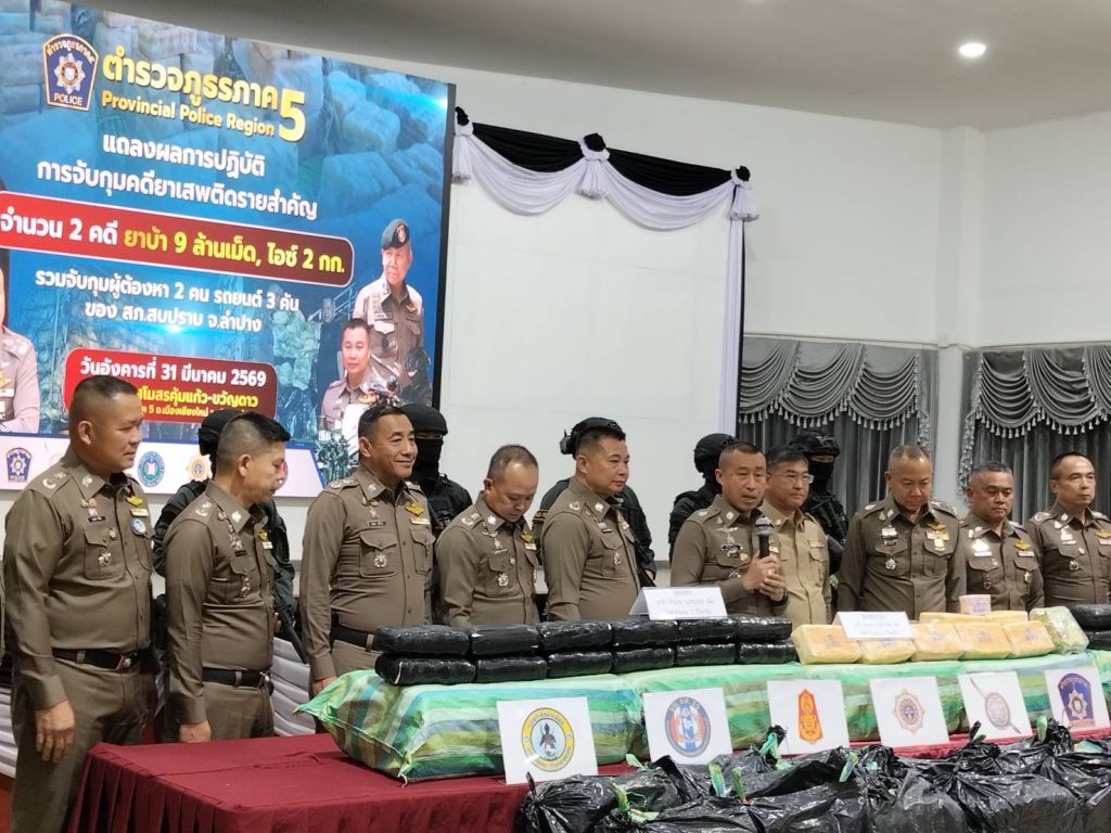 เมื่อวันที่ 31 มีนาคม 2569 เวลา 16.30 น. ณ อาคารคุ้มแก้วขวัญดาว ภ.5 ตำรวจภูธรภาค 5 อำเภอเมืองเชียงใหม่ จังหวัดเชียงใหม่ สำนักงานตำรวจแห่งชาติ โดยการอำนวยการของ พล.ต.อ.กิตติ์รัฐ พันธุ์เพ็ชร์ ผบ.ตร., พล.ต.ท.สมประสงค์ เย็นท้วม ผู้ช่วย ผบ.ตร., พ.ต.ต.สุริยา สิงหกมล เลขาธิการ ป.ป.ส. และ พล.ท.วรเทพ บุญญะ มทภ.3 ได้มอบหมายให้ พล.ต.อ.สำราญ นวลมา รอง ผบ.ตร. เดินทางมาเป็นประธานการแถลงข่าว โดยมี พล.ต.ท.กฤตธาพล ยี่สาคร ผบช.ภ.5,พล.ต.ต.ธนรัชต์ ขุ่มสวัสดิ์ รอง ผบช.ภ.5 ,พล.ต.ตซธวัชชัย พงษ์วิวัฒนชัย รอง ผบช.ภ.5 ,พล.ต.ต.จิตตต์พิสุทธิ์ อิ่มสงวน ผบก.สส.ภ.,พล.ต.ต.ภูมิปัญญ์ญา นวะตระกูลพิสุทธิ์ ผบก.ภ.จว.บำปาง พร้อมคณะ ร่วมกับฝ่ายทหาร นบ.ยส.35, ฝ่ายปกครอง โดยนาย วิวัฒน์ อินทร์ไทยวงศ์ ผวจ.ลำปาง และสำนักงาน ปปส.ภาค 5 โดย พ.ต.ท.นริช สอนดิษฐ ผอ.ปปส.ภาค 5 ได้ร่วมกันแถลงผลการจับกุมคดียาเสพติดรายสำคัญ จำนวน 2 คดี สามารถตรวจยึดยาบ้าได้รวม 9 ล้านเม็ด และไอซ์ 2 กิโลกรัม พร้อมผู้ต้องหา 3 คน