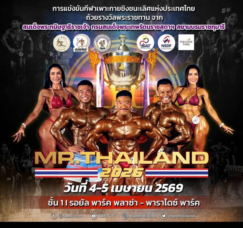 เพาะกาย จัดแข่งขัน กีฬาเพาะกายชิงชนะเลิศแห่งประเทศไทย ประจำปี 2569 ถ้วยรางวัลพระราชทานจากสมเด็จพระกนิษฐาธิราชเจ้า กรมสมเด็จพระเทพรัตนราชสุดาฯ สยามบรมราชกุมารี หรือ มิสเตอร์ไทยแลนด์ วันที่ 4-5 เมษายน 2569 ที่ ศูนย์การค้าพาราไดซ์ พาร์ค เพื่อเฟ้นหานักกีฬาทีมชาติไทย เแชมป์ทุกรุ่นได้สิทธิ์คัดตัวทีมชาติ ลุยแมตช์นานาชาติ 3 รายการ ในปี 2569 ได้แก่ชิงแชมป์อาเซียน, ชิงแชมป์เอเชีย และขิงแชมป์โลก