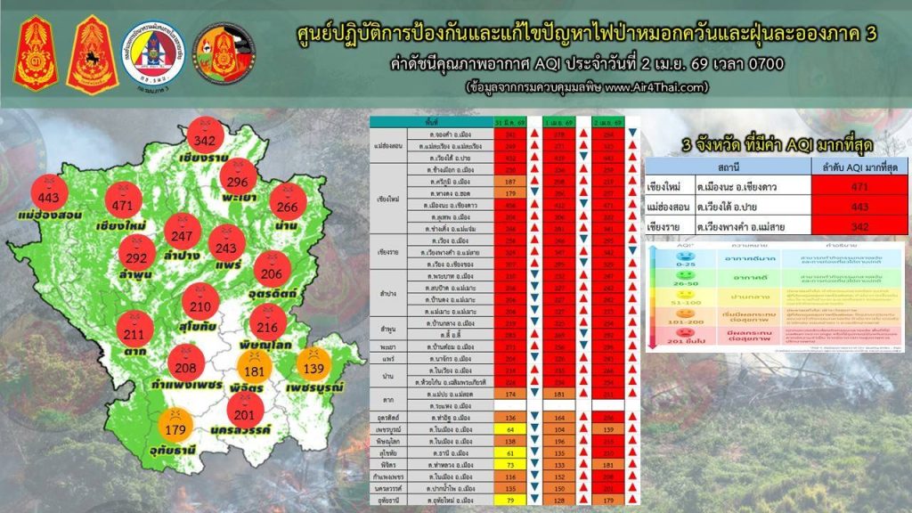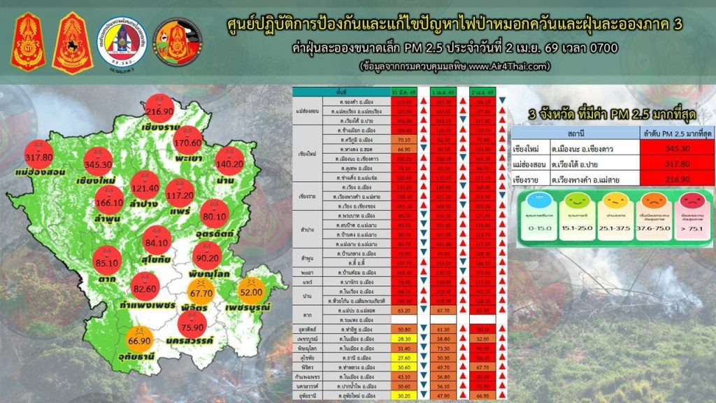 และมีค่าฝุ่นละอองขนาดเล็กเกินเกณฑ์มาตรฐาน จำนวน 17 จังหวัด สูงสุดที่ ต.เมืองนะ อ.เชียงดาว จว.ช.ม. 345.30 มคก./ลบ.ม. รองลงมาคือ ต.เวียงใต้ อ.ปาย จว.ม.ส. 317.80 มคก./ลบ.ม. และ ต.เวียงพานคำ อ.แม่สาย จว.ช.ร. 216.90 มคก./ลบ.ม. (มีผลต่อสุขภาพ)